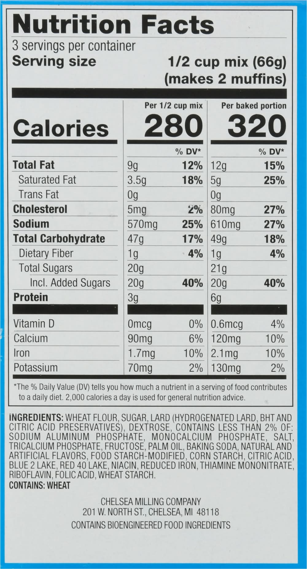 Muffin Mix, Blueberry • Chelsea Milling Company, 201 W. North St., Chelsea, MI, 48118 • Packaging: Reusable