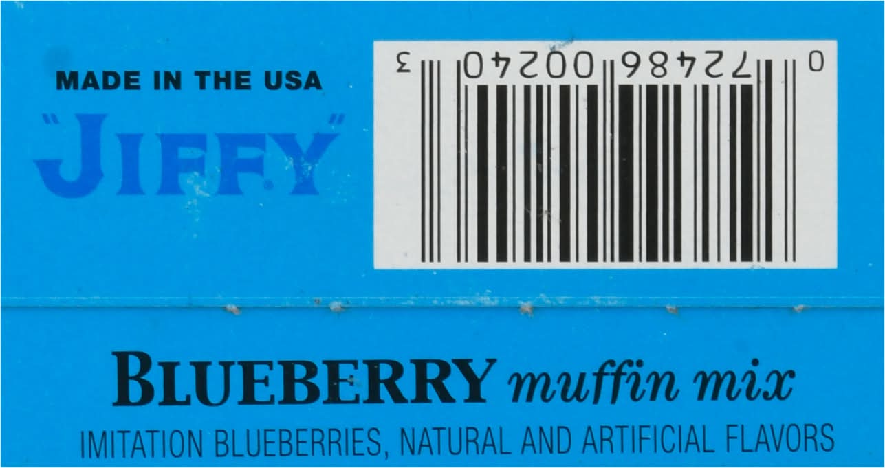Blueberry muffins: yield 6 muffins. 1 pkg. jiffy blueberry; muffin mix 1 egg 1/4 cup milk. preheat oven to 400 degrees f. grease muffin pan or use paper baking cups. stir ingredients together. batter will be slightly lumpy. fill muffin cups 2/3 full. bake 13 - 15 minutes or until lightly browned. do not eat raw batter, dough or mix.