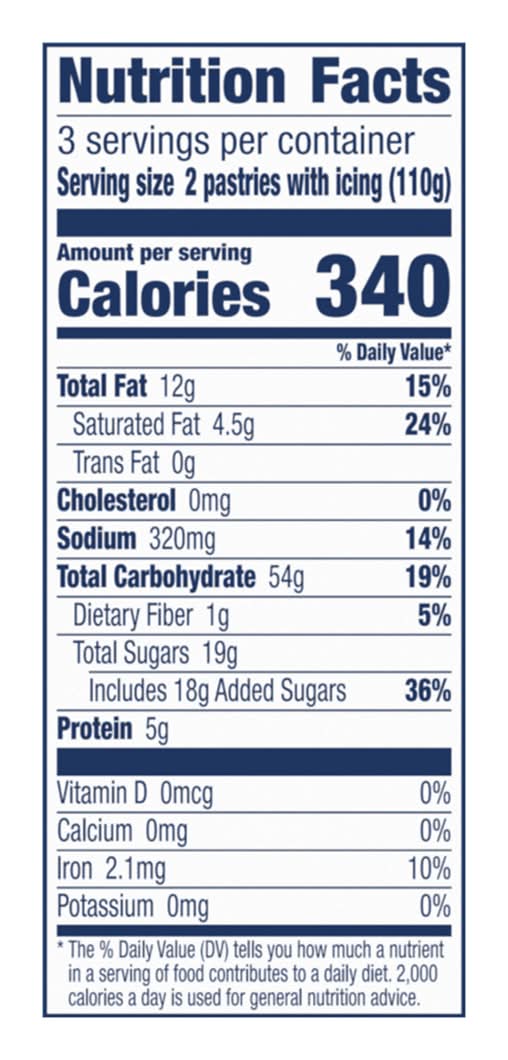 Natural & artificial flavor. Per 2 Pastries with Icing: 340 calories; 4.5 g sat fat (24% DV); 320 mg sodium (14% DV); 19 g total sugars. Contains bioengineered food ingredients. Air fryer ready. Icing included. • General mills sales, inc., Minneapolis,MN,55440 • Packaging: Reusable