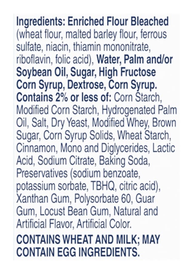 Ingredients: Enriched Flour Bleached (Wheat Flour, Malted Barley Flour, Ferrous Sulfate, Niacin, Thiamin Mononitrate, Riboflavin, Folic Acid), Water, Palm and/or Soybean Oil, Sugar, High Fructose Corn Syrup, Dextrose, Corn Syrup. Contains 2% or Less of: Corn Starch, Modified Corn Starch, Hydrogenated Palm Oil, Salt, Dry Yeast, Modified Whey, Brown Sugar, Corn Syrup Solids, Wheat Starch, Cinnamon, Mono and Diglycerides, Lactic Acid, Sodium Citrate, Baking Soda, Preservatives (Sodium Benzoate, Potassium Sorbate, TBHQ, Citric Acid), Xanthan Gum, Polysorbate 60, Guar Gum, Locust Bean Gum, Natural and Artificial Flavor, Artificial Color Contains: Wheat, Milk, Barley, Corn, Eggs, Soybeans