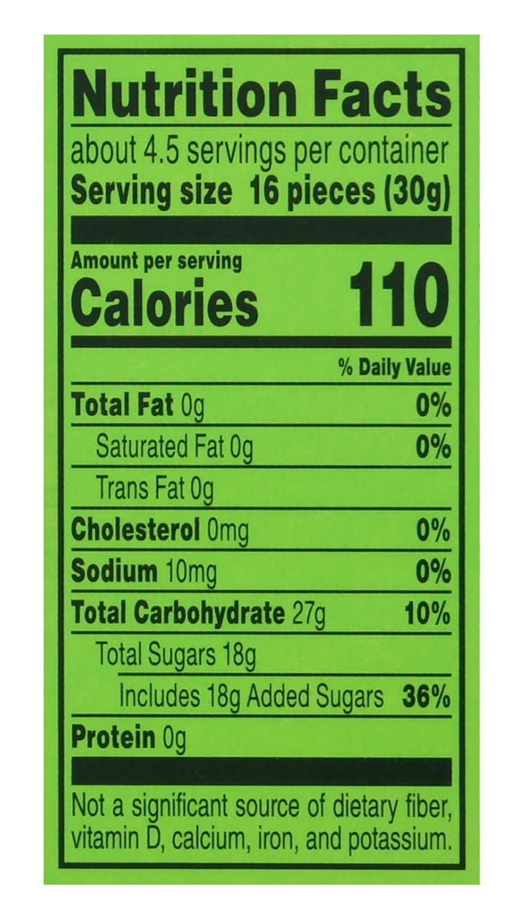 Ingredients: Sugar, Corn Syrup, Modified Food Starch, Contains Less than 0.5% of the Following: Citric Acid, Malic Acid, Fumaric Acid, Sodium Citrate, Natural and Artificial Flavors, Dextrin, Confectioners Glaze, Carnauba Wax, Medium Chain Triglycerides, Red 40, Yellow 6, Yellow 5 (Tartrazine), Blue 1