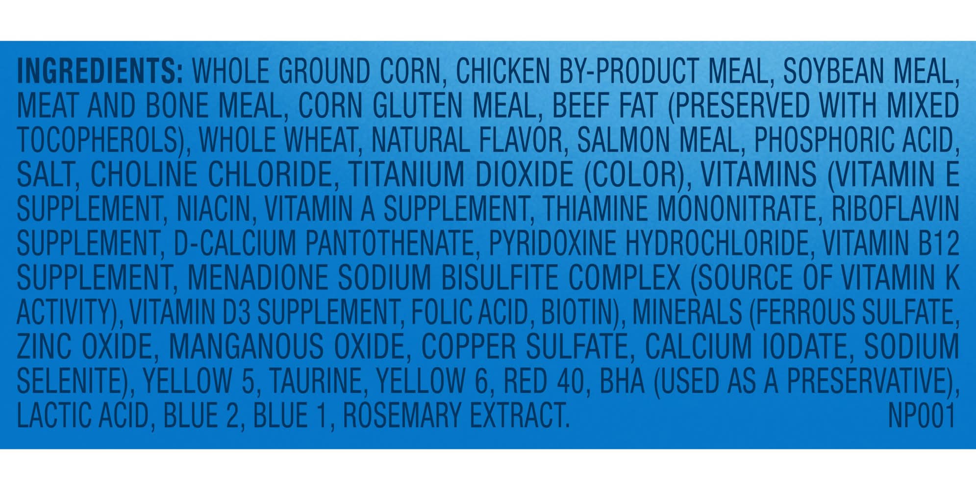 Ingredients: Whole Ground Corn, Chicken By-Product Meal, Soybean Meal, Meat And Bone Meal, Corn Gluten Meal, Beef Fat (Preserved With Mixed Tocopherols), Whole Wheat, Natural Flavor, Salmon Meal, Phosphoric Acid, Salt, Choline Chloride, Titanium Dioxide (Color), Vitamins (Vitamin E Supplement, Niacin, Vitamin A Supplement, Thiamine Mononitrate, Riboflavin Supplement, D-Calcium Pantothenate, Pyridoxine Hydrochloride, Vitamin B12 Supplement, Menadione Sodium Bisulfite Complex (Source Of Vitamin K Activity), Vitamin D3 Supplement, Folic Acid, Biotin), Minerals (Ferrous Sulfate, Zinc Oxide, Manganous Oxide, Copper Sulfate, Calcium Iodate, Sodium Selenite), Yellow 5, Taurine, Yellow 6, Red 40, Bha (Used As A Preservative), Lactic Acid, Blue 2, Blue 1, Rosemary Extract Contains: Corn, Sulfites, Soybeans, Gluten, Fish, Salmon, Wheat