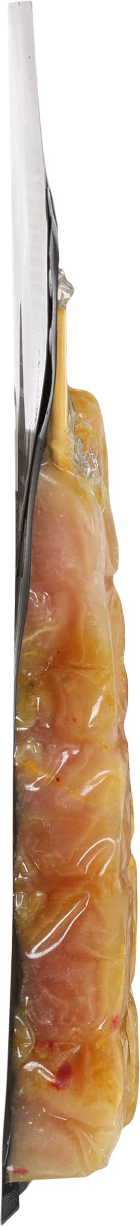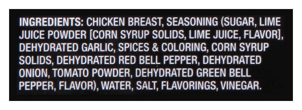 Ingredients: Chicken Breast, Seasoning (Sugar, Lime Juice Powder [Corn Syrup Solids, Lime Juice, Flavor], Dehydrated Garlic, Spices E, Coloring, Corn Syrup Solids, Dehydrated Red Bell Pepper, Dehydrated Onion, Tomato Powder, Dehydrated Green Bell Pepper, Flavor), Water, Salt, Flavorings, Vinegar