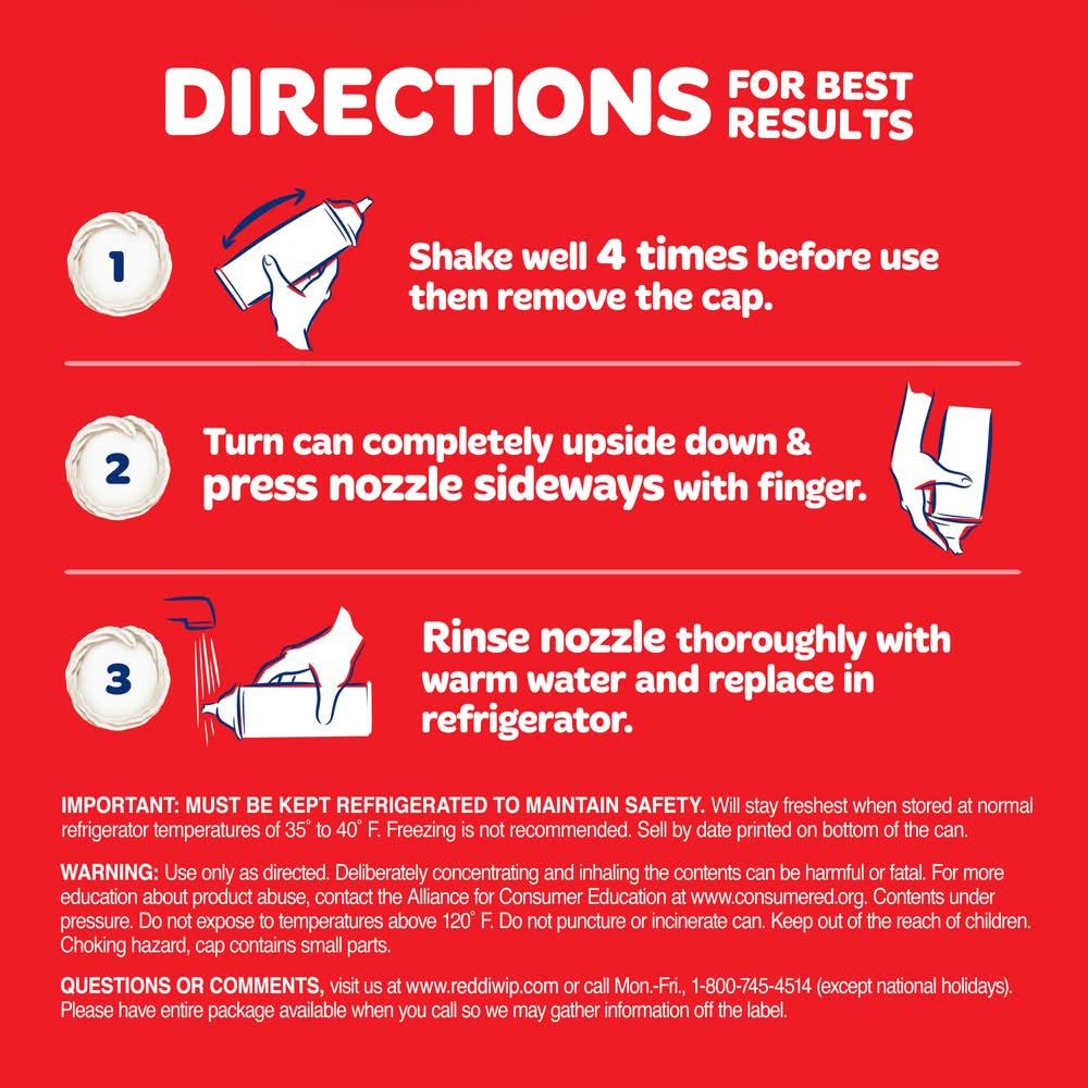 Directions for use: 1. Shake can well before use, then remove cap. 2. Turn can completely upside down and press nozzle sideways with finger. 3. Rinse nozzle thoroughly with warm water. Shake off excess water and replace in refrigerator. Storage: keep refrigerated. Will stay freshest when stored at normal refrigerator temperatures of 35 degrees to 40 degrees F. Freezing is not recommended. Storage recommendation: Important: Must be kept refrigerated to maintain safety. Will stay freshest when stored at normal refrigerator temperatures of 35 degrees to 40 degrees F. Freezing is not recommended.