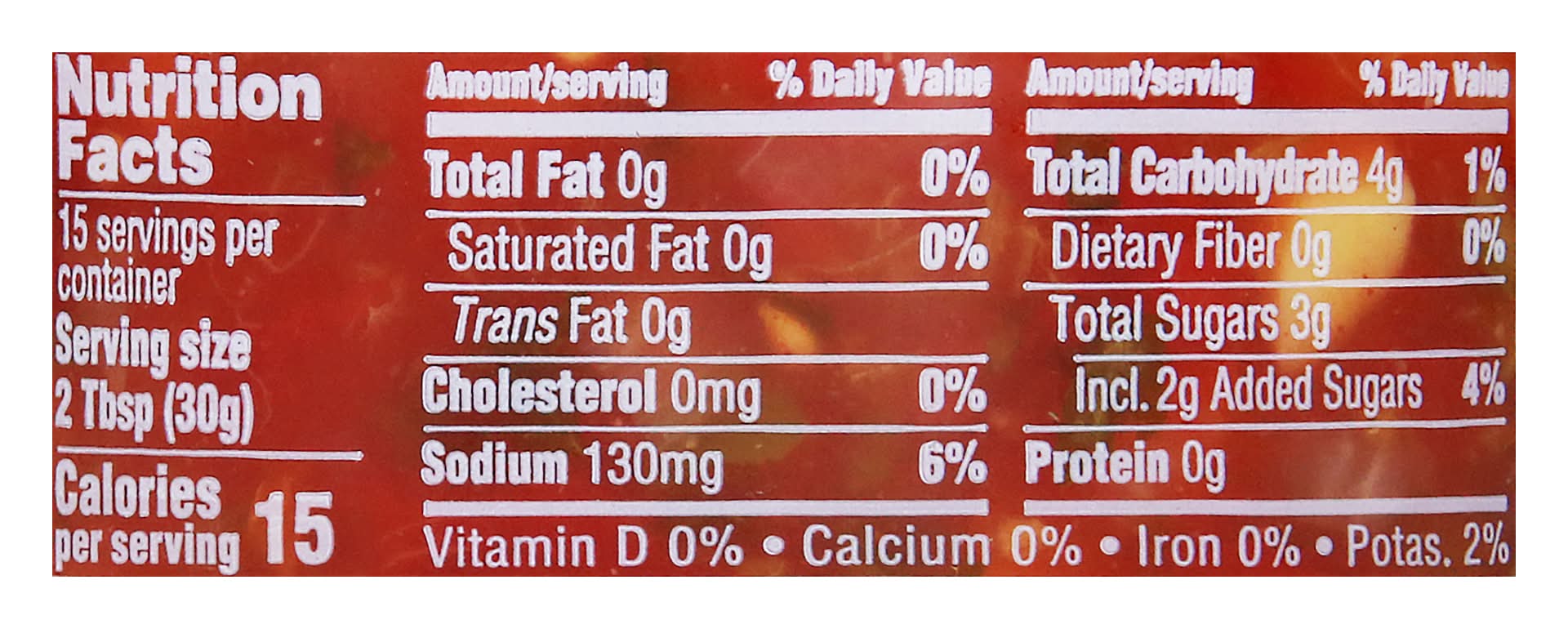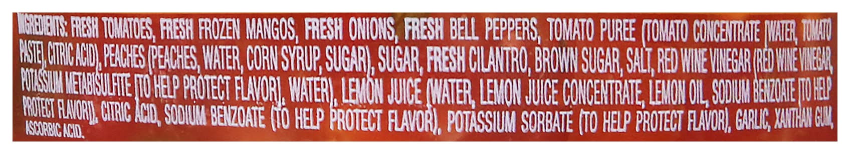 Ingredients: Fresh Ingredients: Onions, Bell Peppers, Cilantro, Fresh Tomatoes, Fresh Frozen Mangos, Fresh Onions, Fresh Bell Peppers, Tomato Puree (Tomato Concentrate (Water, Tomato Paste, Citric Acid), Peaches (Peaches, Water, Corn Syrup, Sugar), Sugar, Fresh Cilantro, Brown Sugar, Salt, Red Wine Vinegar (Red Wine Vinegar Potassium Metabisulfite to Help Protect Flavor, Water), Lemon Juice (Water, Lemon Juice Concentrate, Lemon Oil, Sodium Benzoate to Help Protect Flavor, Citric Acid, Sodium Benzoate (to Help Protect Flavor), Potassium Sorbate (to Help Protect Flavor), Garlic, Xanthan Gum, Ascorbic Acid Contains: Corn