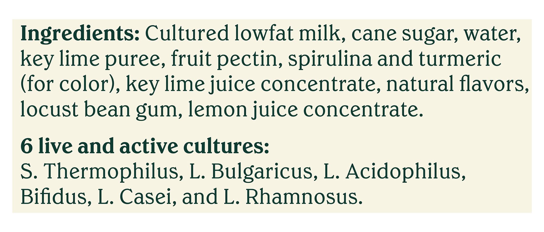 Ingredients: Cultured Lowfat Milk, Cane Sugar, Water, Key Lime Puree, Fruit Pectin, Spirulina and Turmeric (for Color), Key Lime Juice Concentrate, Natural Flavors, Locust Bean Gum, Lemon Juice Concentrate Contains: Milk