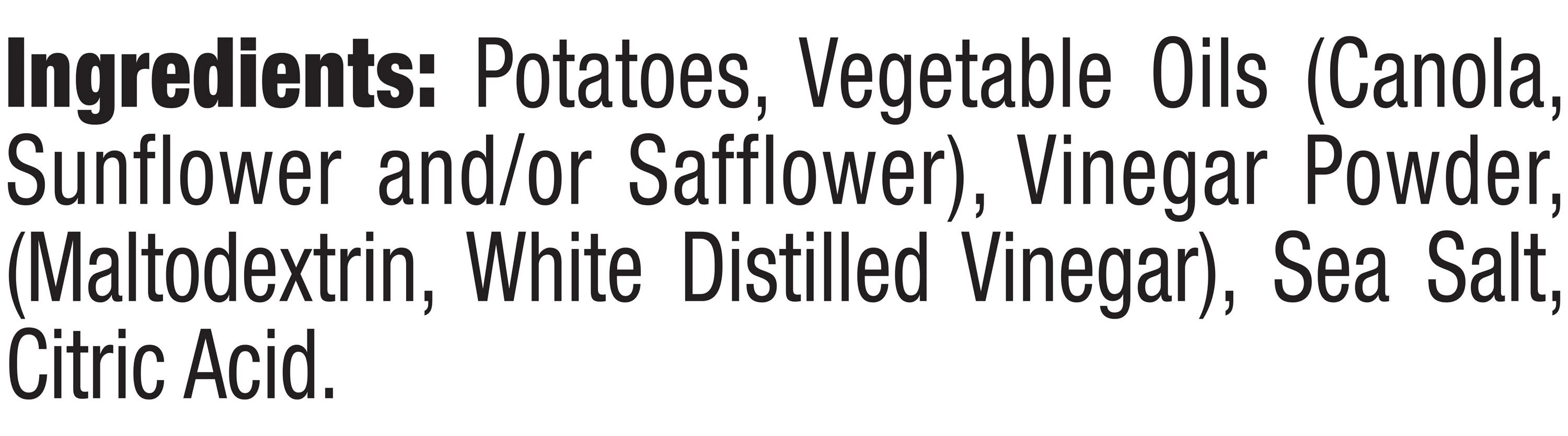 Ingredients: INGREDIENTS: POTATOES, VEGETABLE OILS (CANOLA, SUNFLOWER AND/OR SAFFLOWER), VINEGAR POWDER (MALTODEXTRIN, WHITE DISTILLED VINEGAR), SEA SALT, CITRIC ACID.