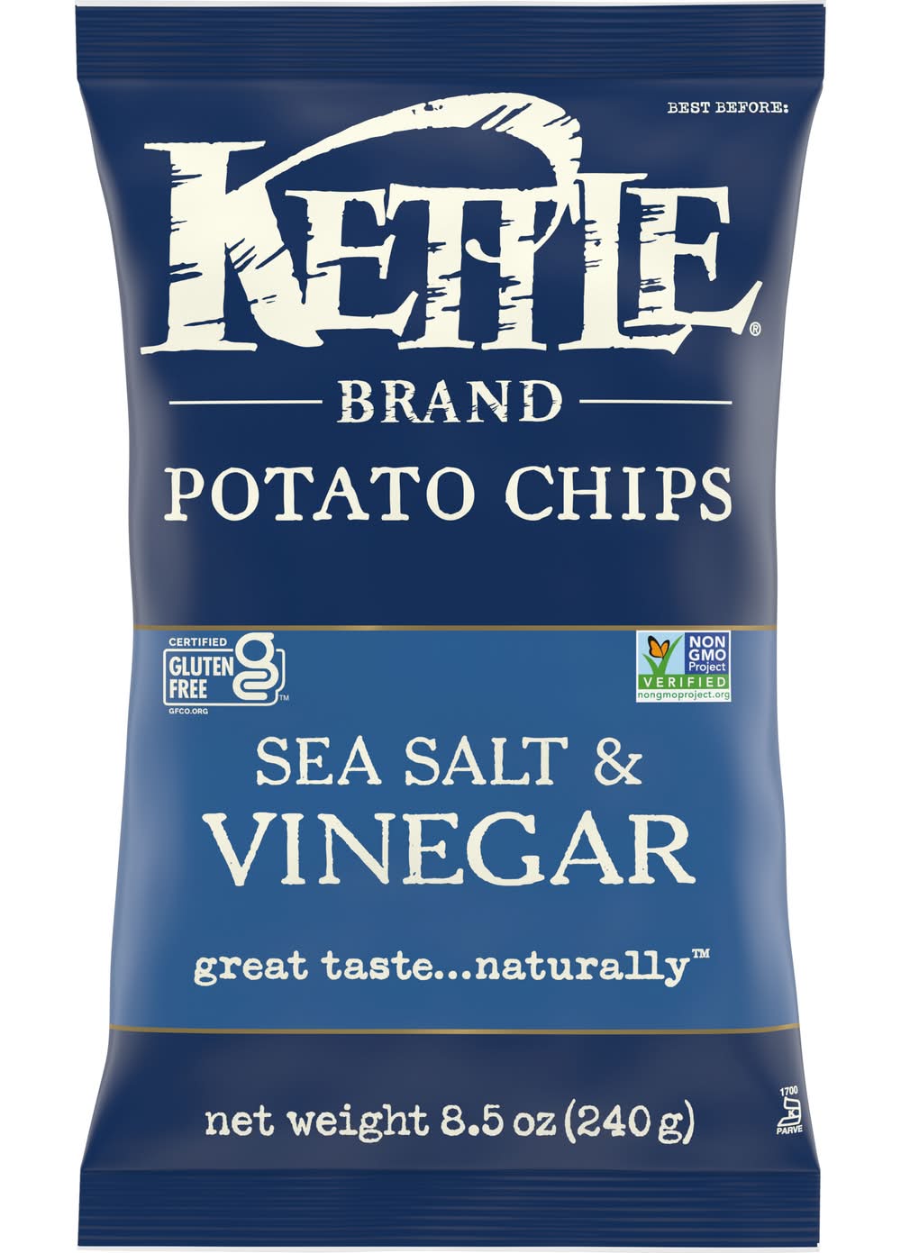 Kettle Brand Salt & Vinegar kettle chips start with a search for undisputed potato excellence. Determined not to disrupt the flawless, spudsy goodness, these beauties are kettle cooked, skins on, one small batch at a time. Delight your taste buds with the delicate balance of sea salt and a hint of tongue-puckering vinegar. And of course, these chips come complete with the satisfying crunch you love. When you open a bag of our Kettle Brand potato chips, you know you're getting incredible kettle chips made with authentic recipes by real people. From their farms to our kitchens and then to your home, the time and attention every Kettle Brand worker puts into their products is care you can trust. All that, plus Kettle Brand chips deliver a delicious snack that’s non-GMO Project Verified and Certified Gluten-Free. This large 8.5-ounce bag of chips is perfect for sharing at parties, picnics, or just snacking on the couch. Kettle Brand potato chips. Extra in a good way. • Kettle Brand, 3125 Kettle Court SE, Salem, OR • Packaging: Reusable
