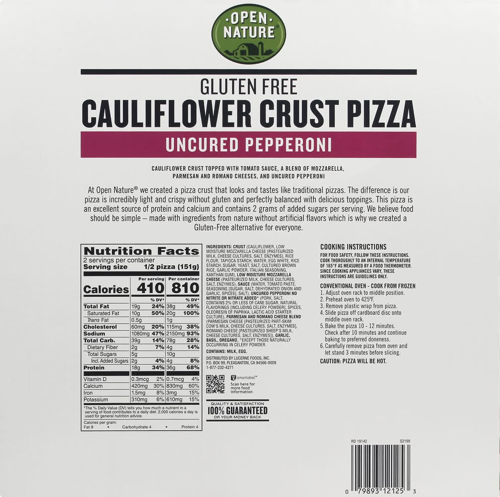 At Open Nature we created a pizza crust that looks and tastes like traditional pizzas. The difference is our pizza is incredibly light and crispy without gluten and perfectly balanced with delicious toppings. This pizza is an excellent source of protein and calcium and contains 2 grams of added sugars per serving. We believe food should be simple - made with ingredients from nature without artificial flavors which is why we created a gluten-free alternative for everyone. Quality & Satisfaction: 100% guarantee or your money back. US Inspected and Passed by Department of Agriculture. Smart label: Scan for more food information. Lucerne Foods, Pleasanton, CA, 94566-0009