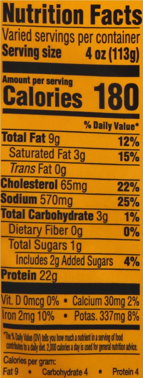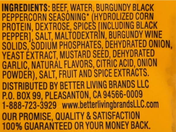 Ingredients: Beef, Water, Burgundy Black Peppercorn Seasoning (Hydrolized Corn Protein, Dextrose, Spices [Including Black Pepper], Salt, Maltodextrin, Burgundy Wine Solids, Sodium Phosphates, Dehydrated Onion, Yeast Extract, Mustard Seed, Dehydrated Garlic, Natural flavors, Citric Acid, Onion Powder), Salt, Fruit and Spice Extracts.