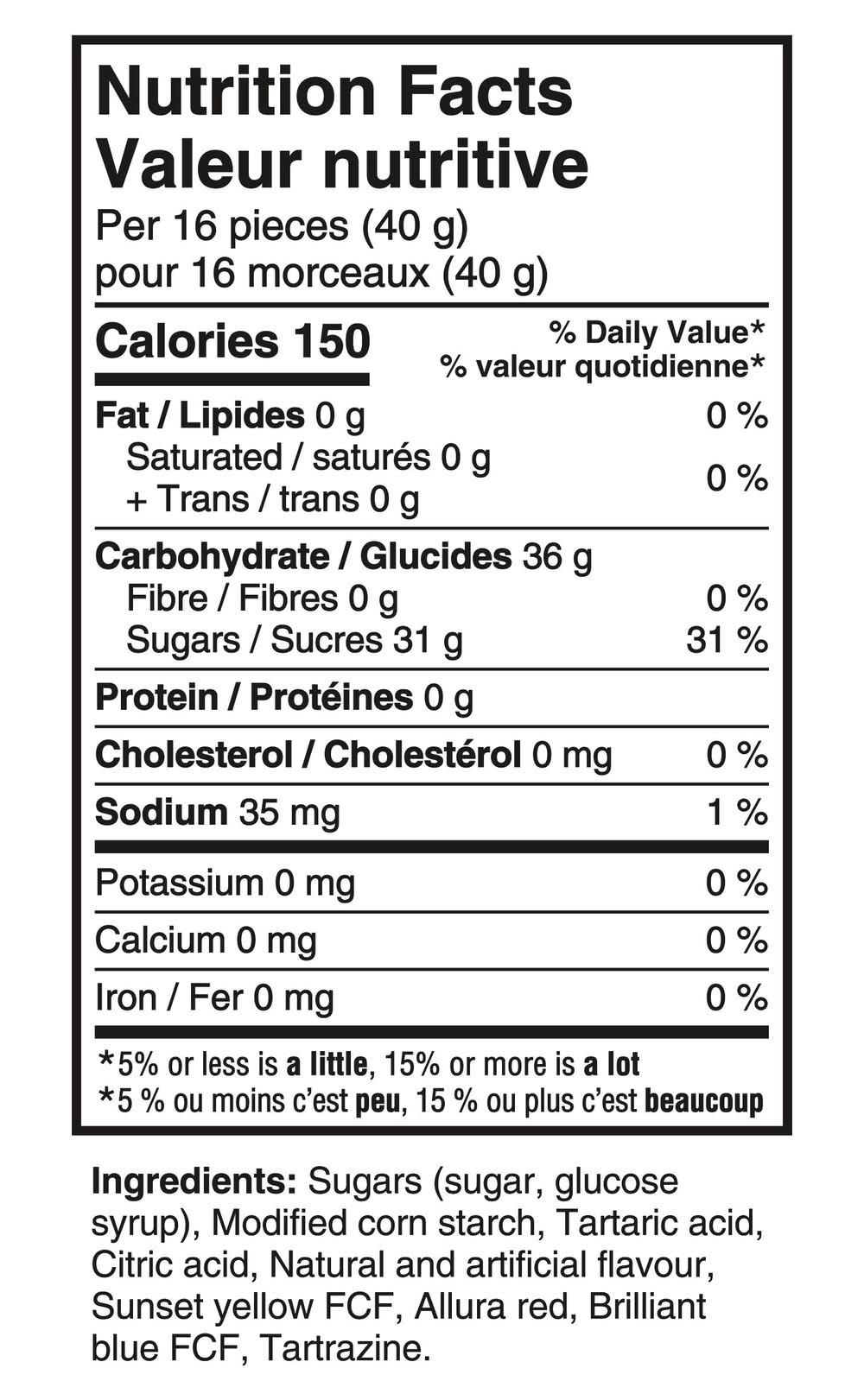 Ingredients: Modified corn starch, Tartaric acid, Citric acid, Natural and artificial flavour, Sunset yellow FCF, Allura red, Brilliant blue FCF, Tartrazine., Sugars (sugar, glucose syrup)