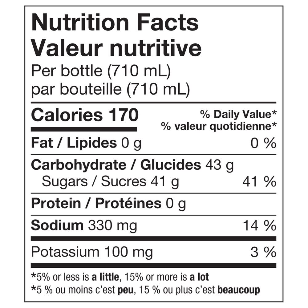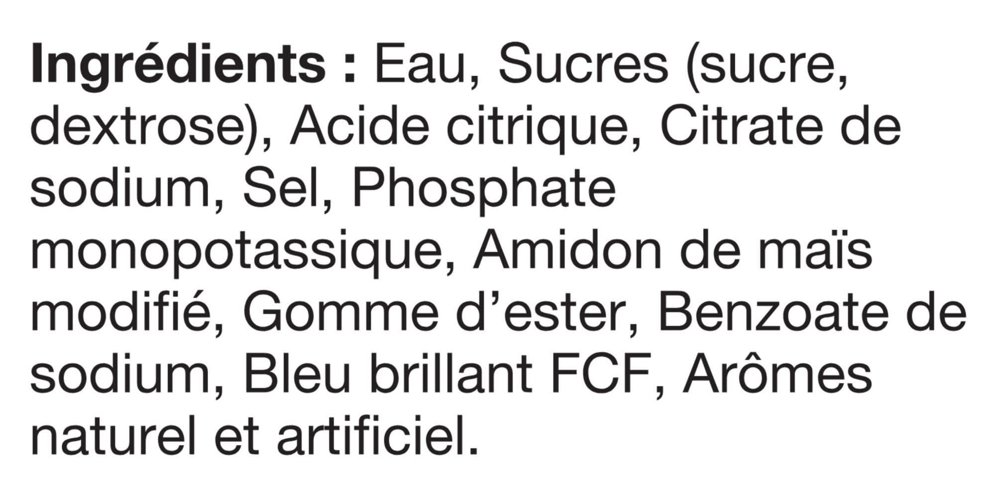Ingredients: WATER, SUGAR, DEXTROSE, CITRIC ACID, NATURAL AND ARTIFICIAL FLAVOURS, SALT, SODIUM CITRATE, MONOPOTASSIUM PHOSPHATE, MODIFIED CORN STARCH, ESTER GUM, COLOUR.