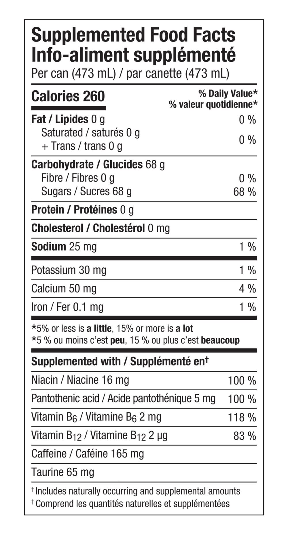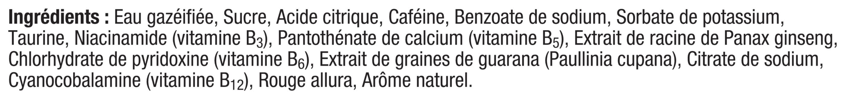 Ingredients: Carbonated water, Sugar, Citric acid, Caffeine, Sodium benzoate, Potassium sorbate, Taurine, Niacinamide (vitamin B3), Calcium pantothenate (vitamin B5), Panax ginseng root extract, Pyridoxine hydrochloride (vitamin B6), Guarana (Paullinia cupana), seed extract, Cyanocobalamin (vitamin B12), Allura red, Natural and artificial flavour.