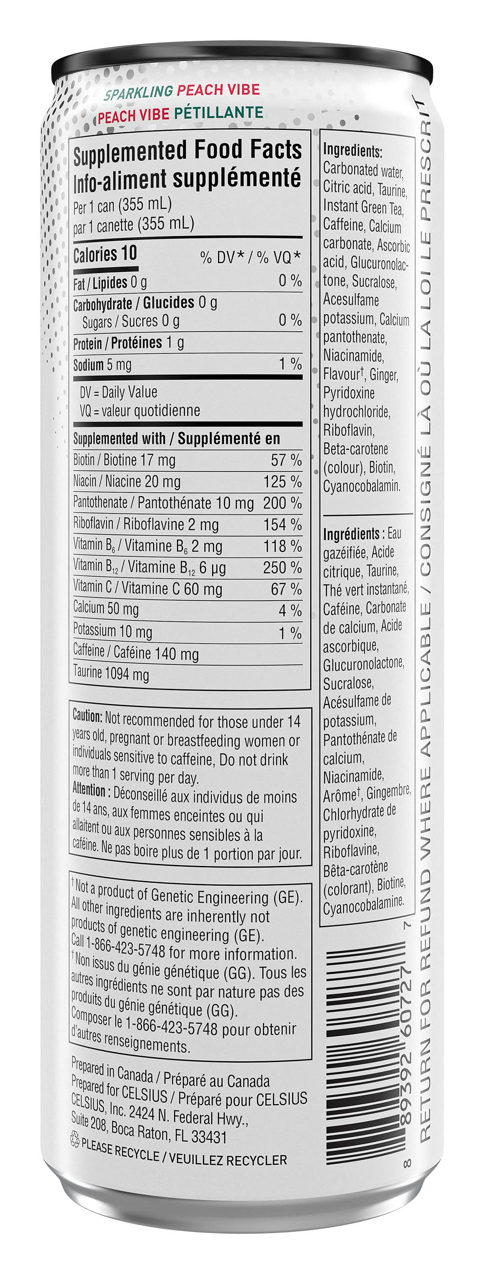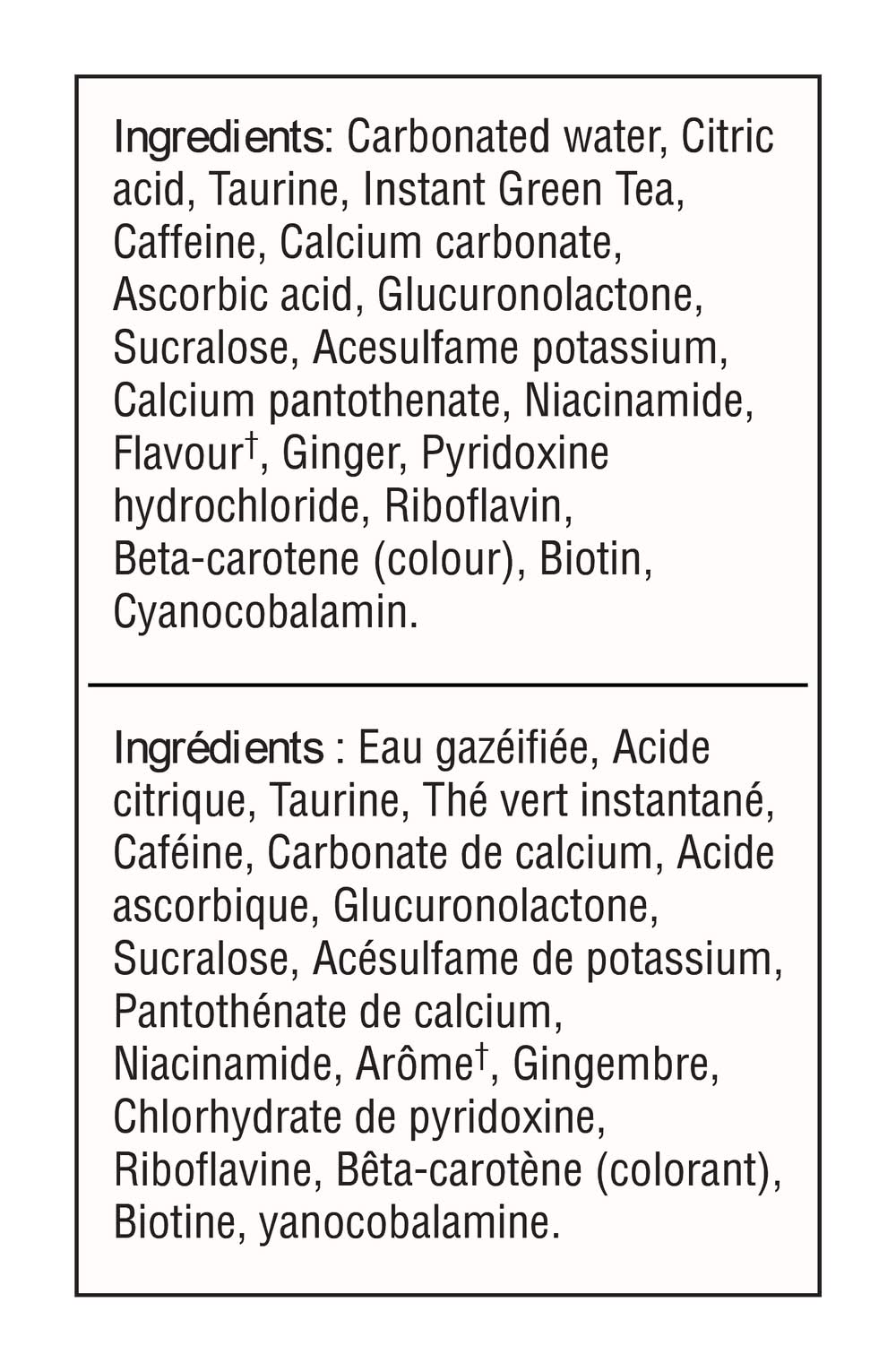 Ingredients: Carbonated water, Citric acid, Taurine, Instant Green Tea, Caffeine, Calcium carbonate, Ascorbic acid, Glucuronolactone, Sucralose, Acesulfame potassium, Calcium pantothenate, Niacinamide, Flavourt, Ginger, Pyridoxine hydrochloride, Riboflavin, Beta-carotene (colour), Biotin, Cyanocobalamin.