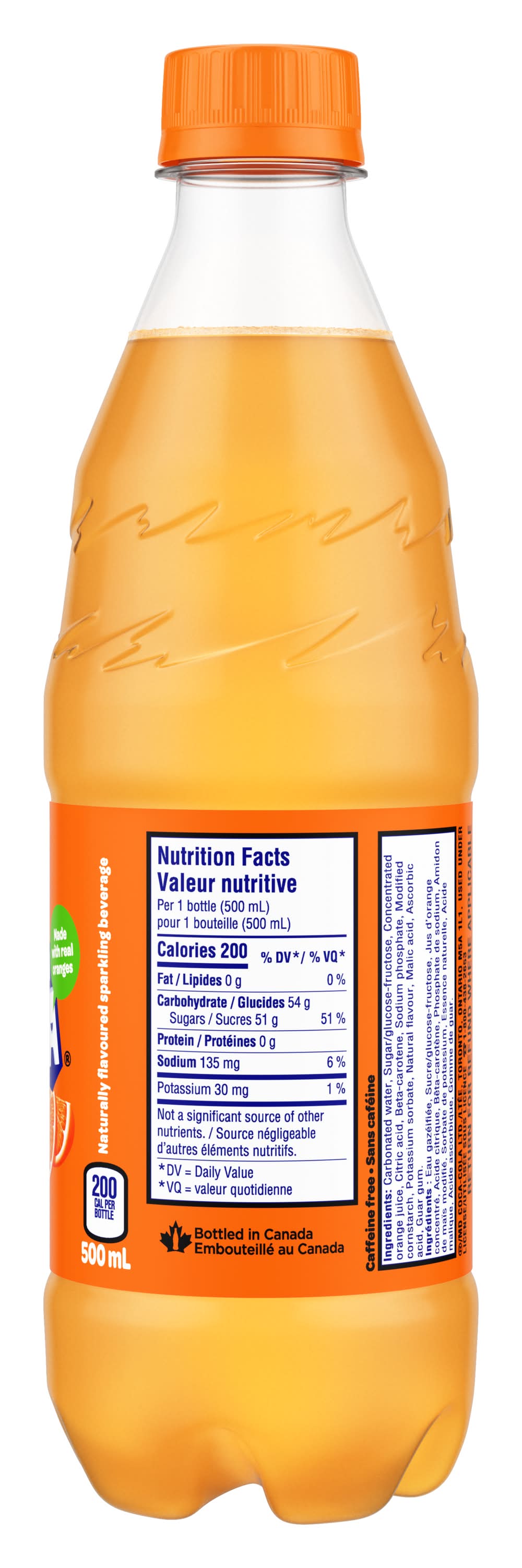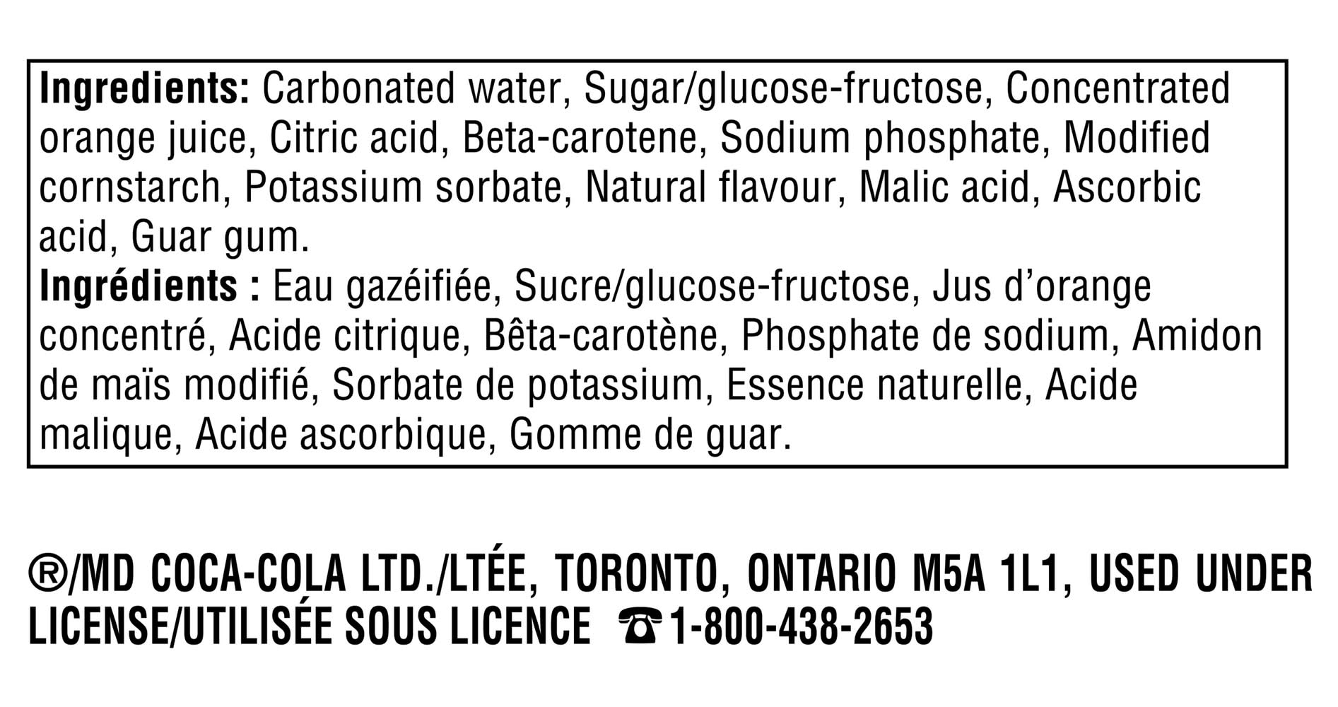 Ingredients: Carbonated water, Sugar/glucose-fructose, Concentrated orange Juice, Citric acid, Beta-carotene, Sodium phosphate, Modified cornstarch, Potassium sorbate, Natural flavour, Malic acid, Ascorbic acid, Guar gum