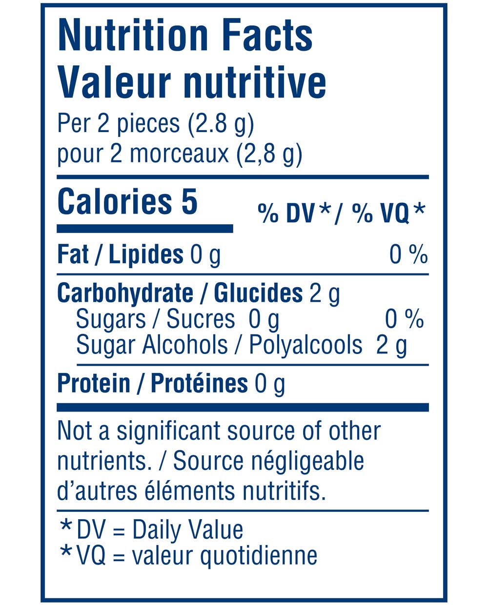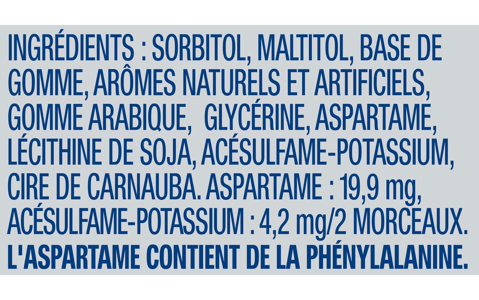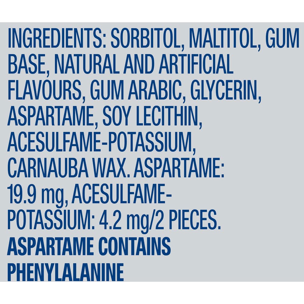 Ingredients: Sorbitol, Maltitol, Gum base, Natural and artificial flavours, Gum arabic, Glycerin, Aspartame, Soy lecithin, Acesulfame-potassium, Carnauba wax.