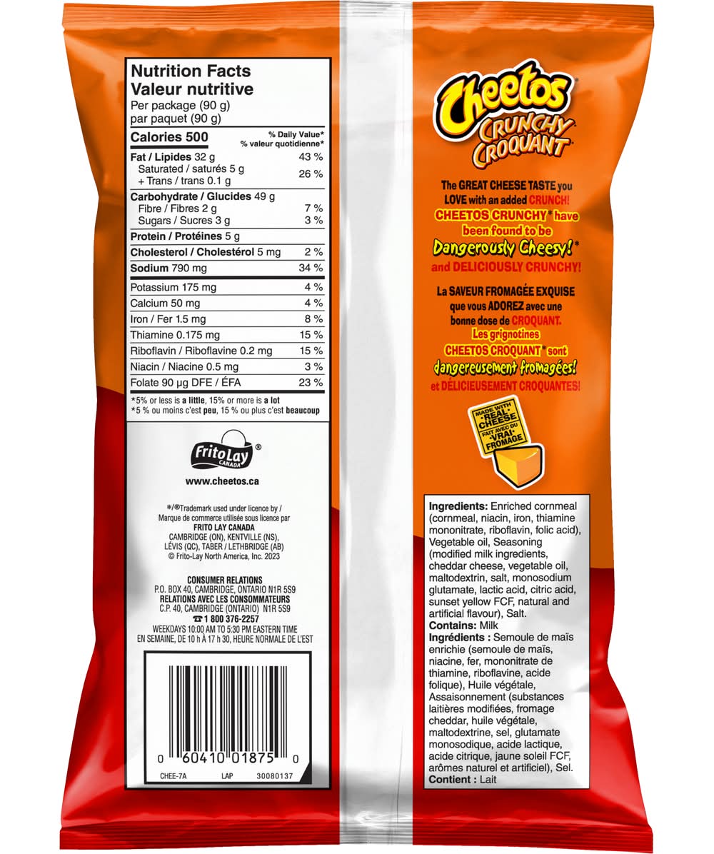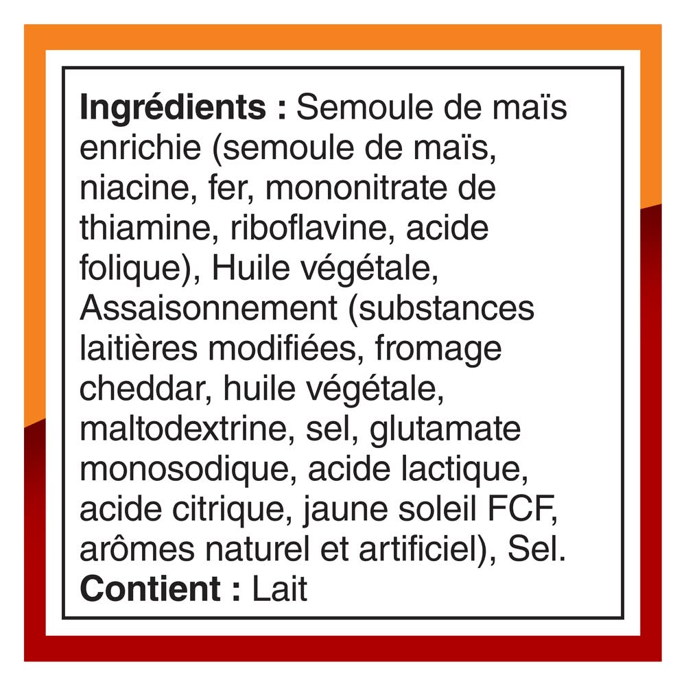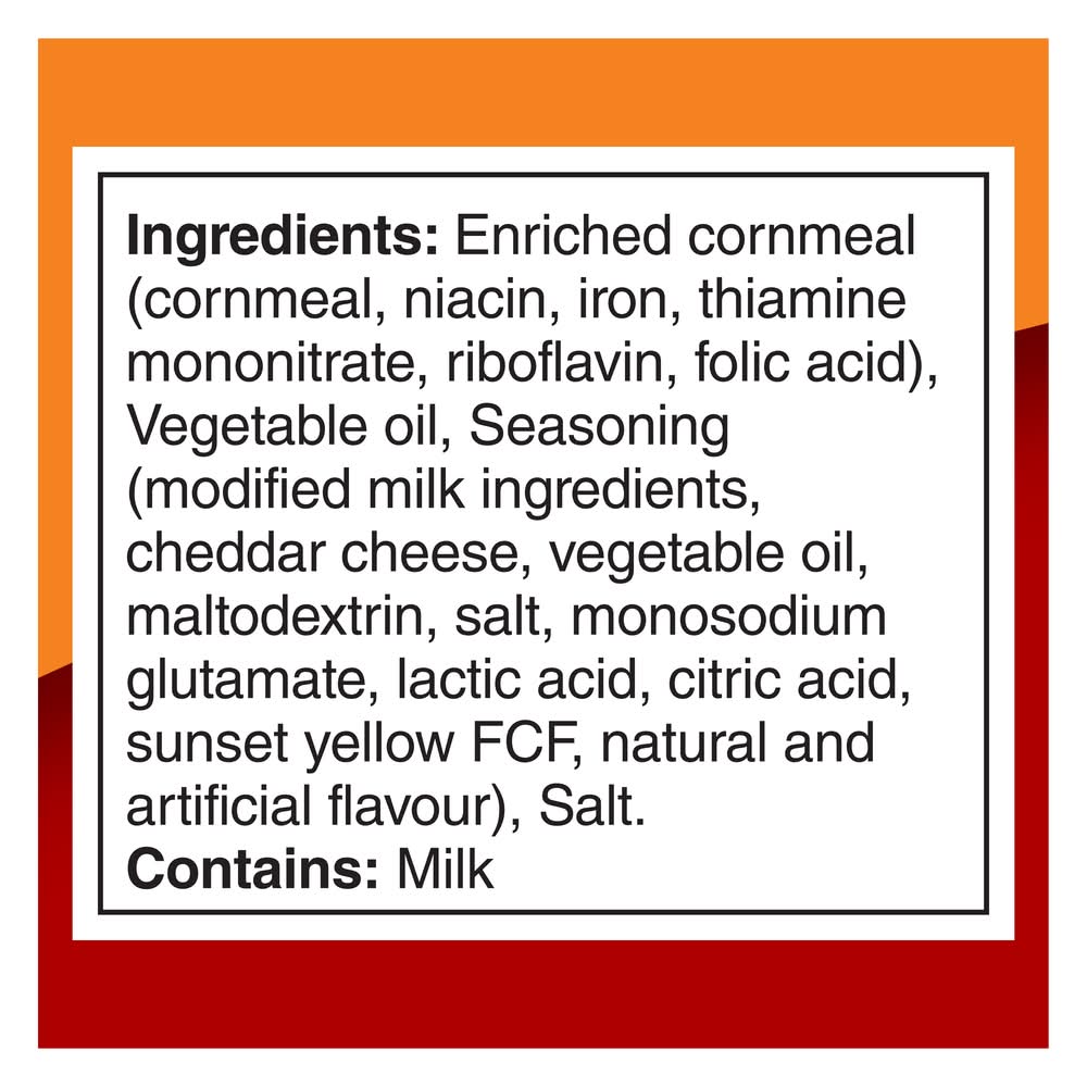 Ingredients: Enriched Cornmeal (Cornmeal, Niacin, Iron, Thiamine Mononitrate, Riboflavin, Folic Acid), Vegetable Oil, Seasoning (Modified Milk Ingredients, Cheddar Cheese, Vegetable Oil, Maltodextrin, Salt, Monosodium Glutamate, Lactic Acid, Citric Acid, Sunset Yellow Fcf, Natural And Artificial Flavour), Salt. Contains Milk Ingredients. Contains: Contains Milk Ingredients.