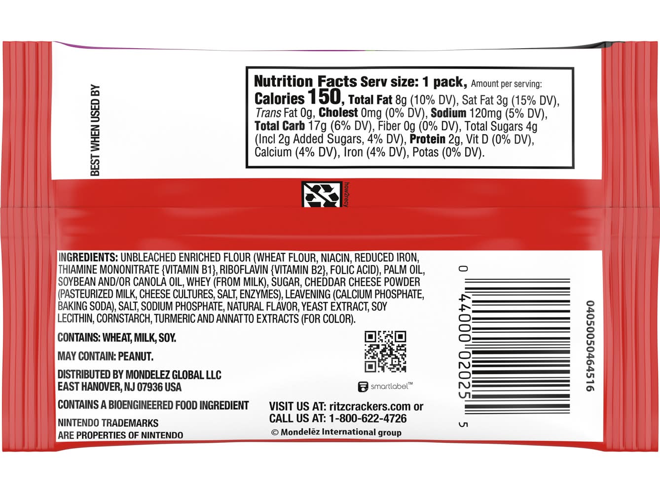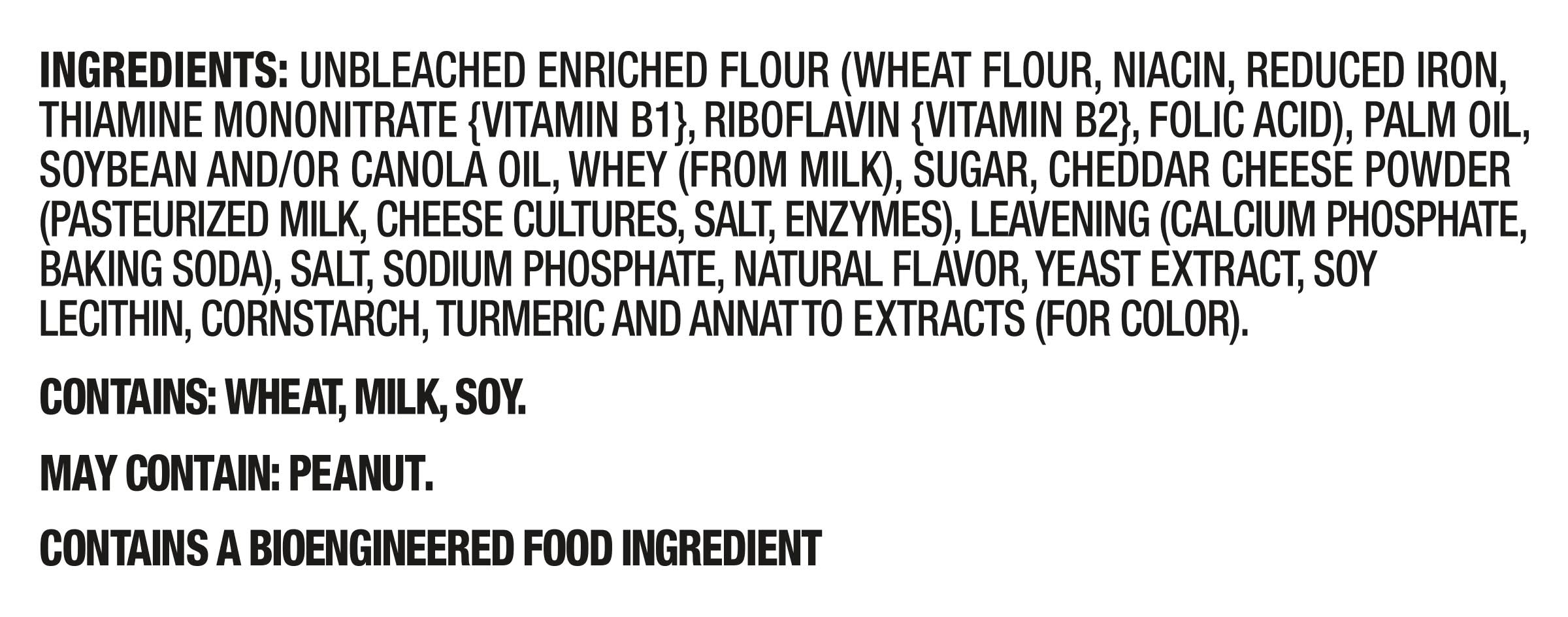 Ingredients: INGREDIENTS: UNBLEACHED ENRICHED FLOUR (WHEAT FLOUR, NIACIN, REDUCED IRON, THIAMINE MONONITRATE [VITAMIN B1], RIBOFLAVIN [VITAMIN B2], FOLIC ACID), PALM OIL, SOYBEAN AND/OR CANOLA OIL, WHEY (FROM MILK), SUGAR, CHEDDAR CHEESE POWDER (PASTEURIZED MILK, CHEESE CULTURES, SALT, ENZYMES), LEAVENING (CALCIUM PHOSPHATE, BAKING SODA), SALT, SODIUM PHOSPHATE, NATURAL FLAVOR, YEAST EXTRACT, SOY LECITHIN, CORNSTARCH, TURMERIC AND ANNATTO EXTRACTS (FOR COLOR).CONTAINS: WHEAT, MILK, SOY.MAY CONTAIN: PEANUT. Contains: CONTAINS: WHEAT, MILK, SOY.MAY CONTAIN: PEANUT.