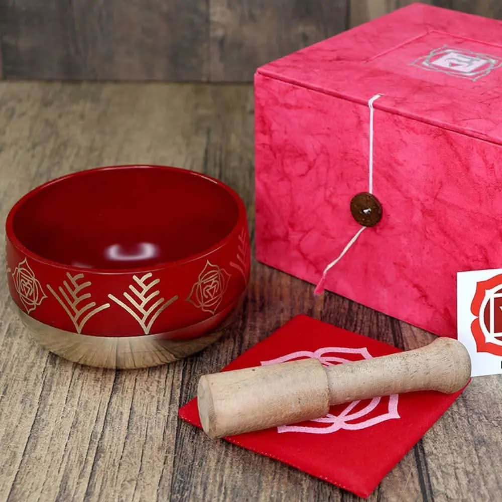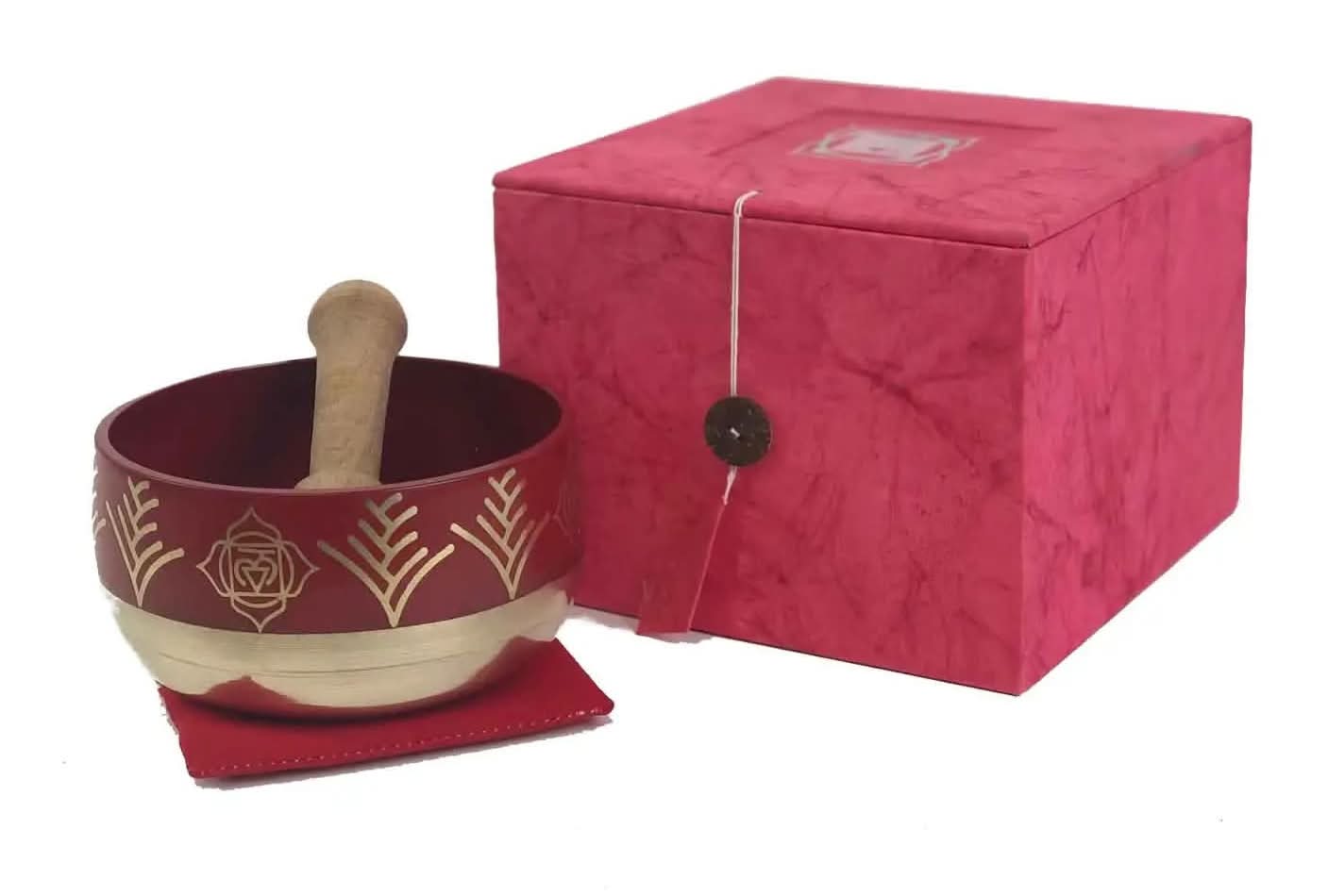 Discover the serenity and spiritual rejuvenation of our Om Script Bowl Gift Box. This set, complete with a baton, is a crucial addition to your meditation supplies. Each bowl is carefully crafted, featuring the tranquil Om script, designed to enhance your mindfulness practices. We at Nature's Artifacts are committed to sharing the beauty and healing power of Mother Nature's resources. Enhance your spiritual journey with our ethically sourced, hand-picked products, blending nature with science for a unique healing experience. Made in India with love. 5" Tibetan singing bowl gift bowl set includes a singing bowl, cushion and baton in a gift box. The red color corresponds to the root chakra. These singing bowls are NOT tuned to the corresponding chakra tunes, however they work great with chakra color meditation.