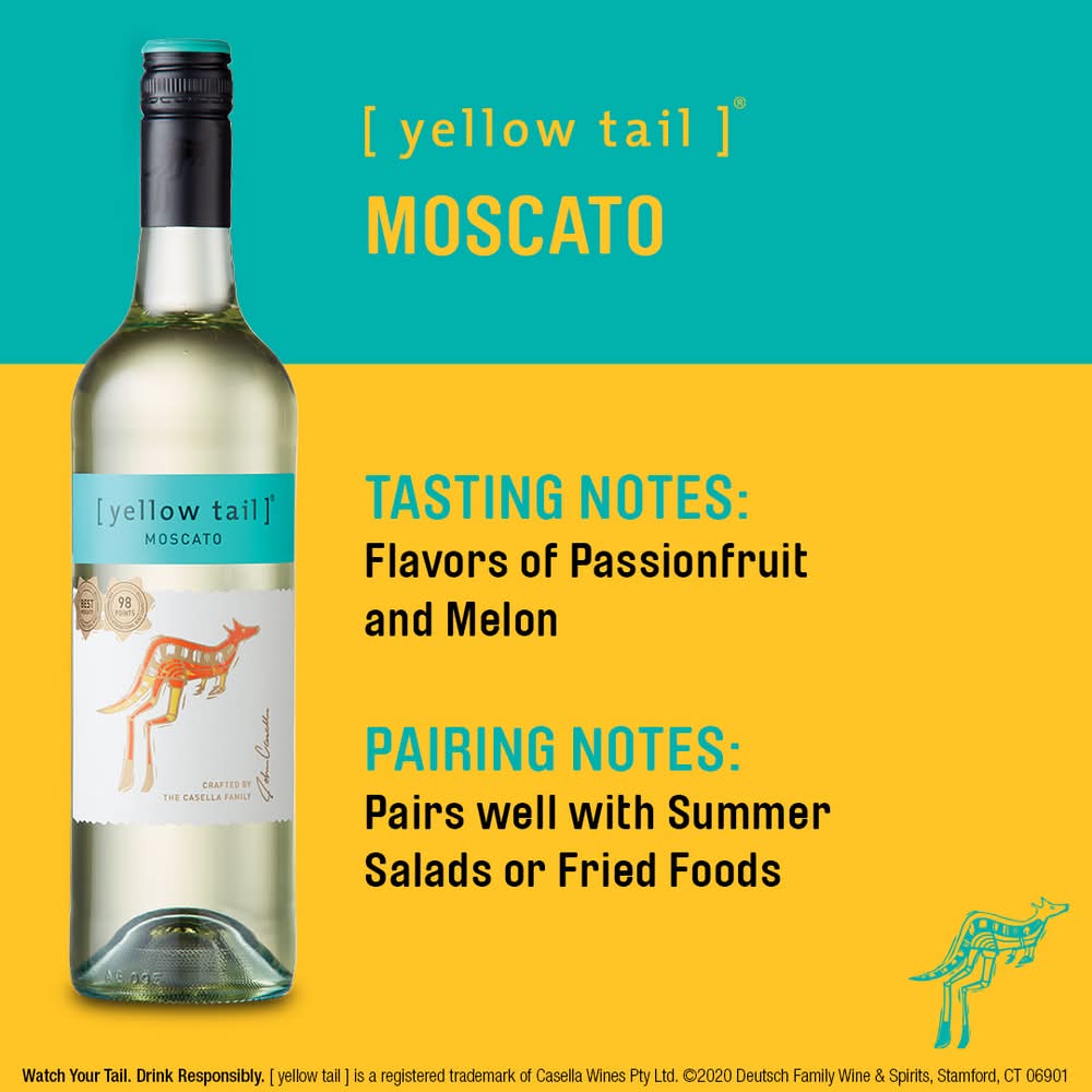 Made in South Eastern Australia, [ yellow tail ] Moscato is a white wine that brings the flavors and essence of the region to your glass, ensuring a smile with each sip. This moscato is everything a great wine should be with its easy to drink, refreshing taste and bright flavor profile. Featuring zingy flavors of passionfruit, kiwi and sweet melon, this white wine is light bodied and with a soft palate. This moscato wine has a light fizz that tingles in your mouth highlighting lively tropical fruit flavors and a crisp acidity. Enjoy the sweet white wine with an Asian-inspired dinner or dessert. [ yellow tail ] wine is wonderful for livening up casual dinners with loved ones and bringing a lighthearted spirit to any and every event and celebration. This bottle of wine is 750 ml and has a 7.5% ABV. Great quality wine can be affordable and good fun too. We like our wines to be vibrant, flavorsome and approachable, making everyday moments even more enjoyable. A wine for any occasion, [ yellow tail ] is easy to choose, drink and enjoy. • Alcohol by volume: 7.5% • 0