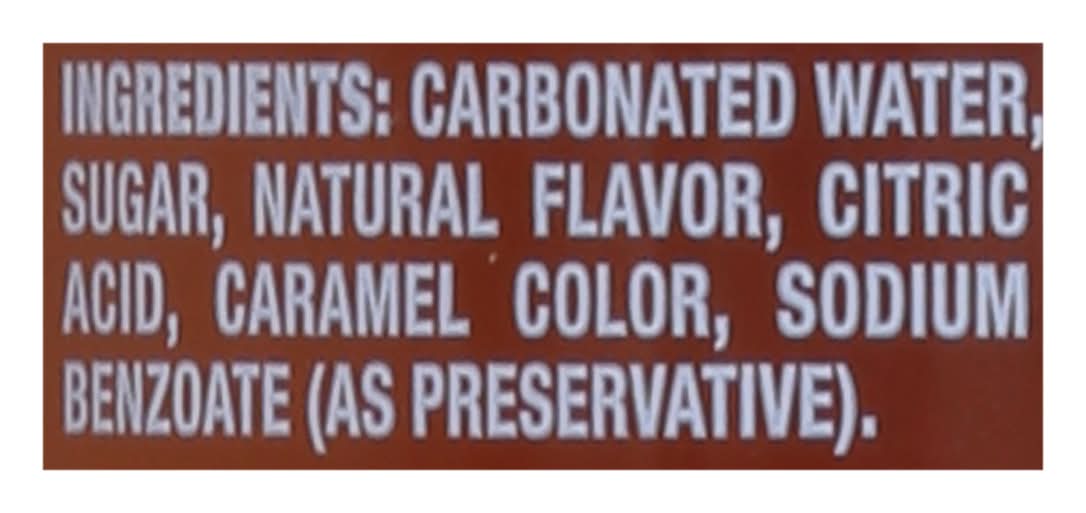 Ingredients: Carbonated Water, Sugar, Natural Flavor, Citric Acid, Caramel Color, Sodium Benzoate (as Preservative)