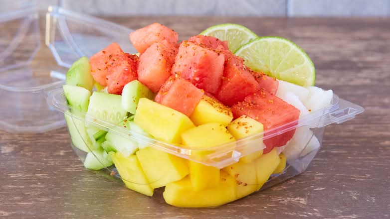 Fresh fruit salad: Mango, pineapple, watermelon, cucumber, and jicama, sprinkled with Tajin and fresh lime