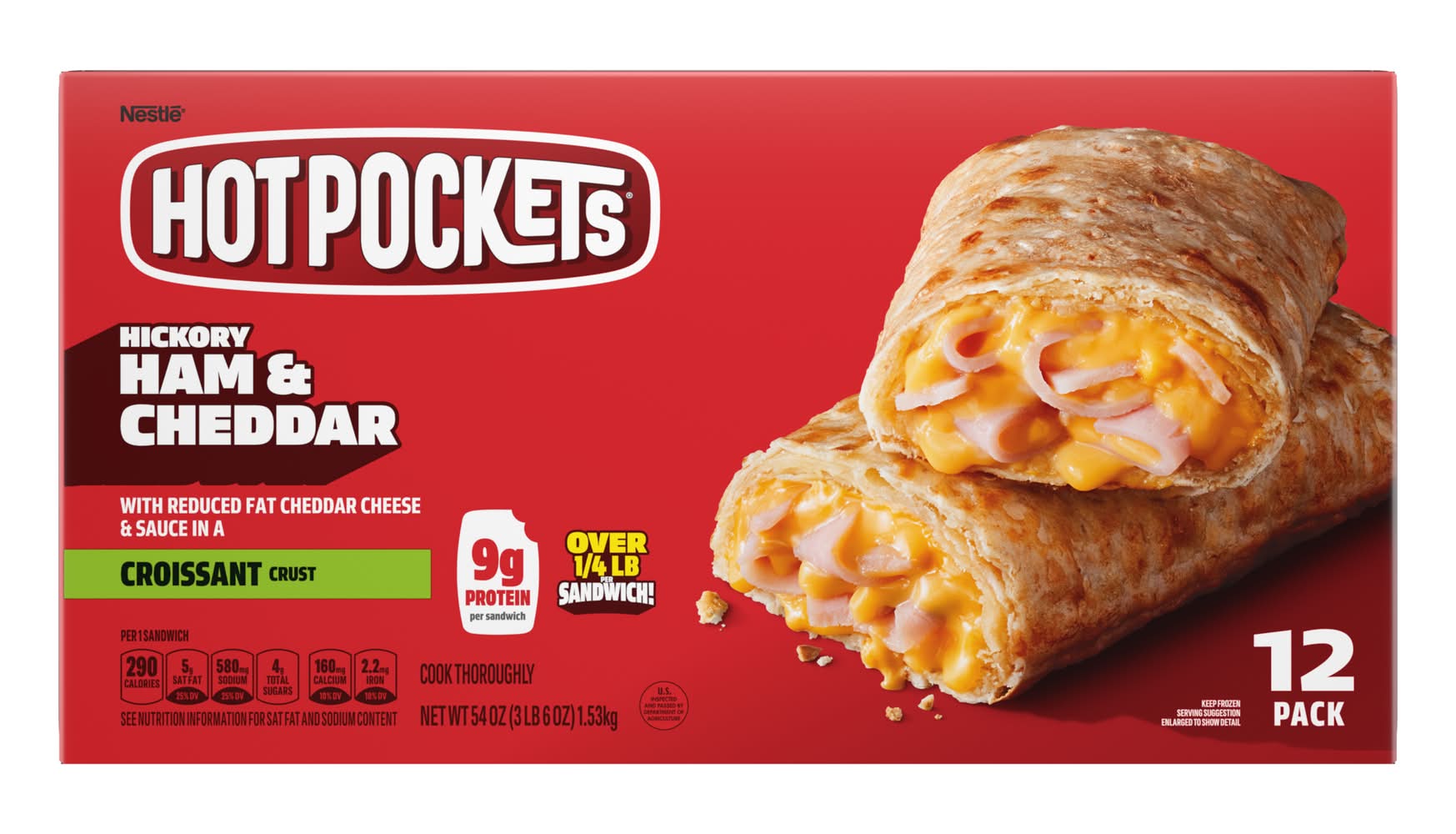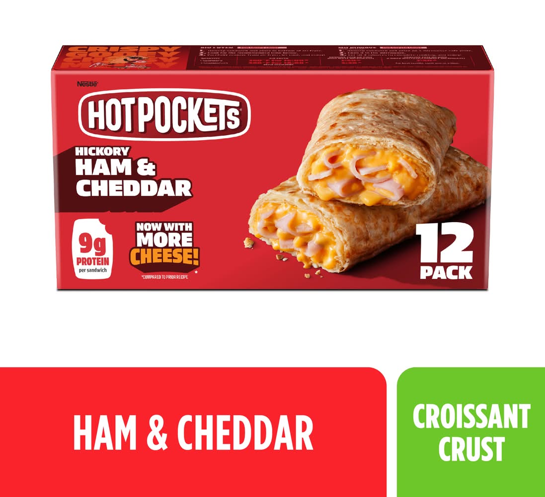 Dive into the cheesy, saucy and savory world of snacking with Hot Pockets frozen snacks. Our frozen sandwiches are loaded with hickory ham along with reduced fat cheddar cheese inside a delicious croissant crust. These indulgent Hot Pockets aren’t your average frozen lunch snacks. Hot Pockets sandwiches are hunger’s worst nightmare, delivering the bold flavors of ham and cheddar cheese in a hearty microwaveable snack. Great for gaming all night, a quick snack after school or a quick bite before heading out the door -- ham and cheese Hot Pockets are perfect for any occasion. Each ham and cheese croissant is a good source of protein with 9 grams per sandwich. Cook this microwave food for 1 minute, 50 seconds on high and let cool for 2 minutes for an on-the-go snack. Air fry at 360 degrees Fahrenheit for 16 minutes. Hot Pockets sandwiches are hot and delicious every time. Keep these ham and cheese Hot Pockets sandwiches frozen until ready to cook and eat. • Number of servings: 12 • Packaging: Reusable