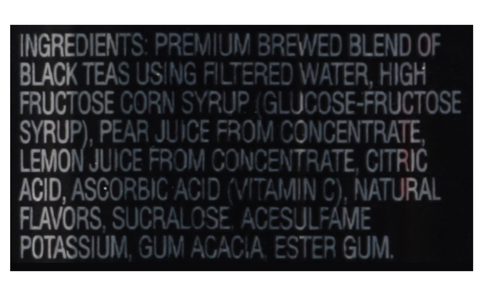 Ingredients: Premium Brewed Blend of Black Teas Using Filtered Water, High Fructose Corn Syrup (Glucose-Fructose Syrup), Lemon Juice from Concentrate, Pear Juice from Concentrate, Citric Acid, Ascorbic Acid (Vitamin C), Natural Flavors, Sucralose (Splenda Brand), Acesulfame Potassium, Gum Acacia
