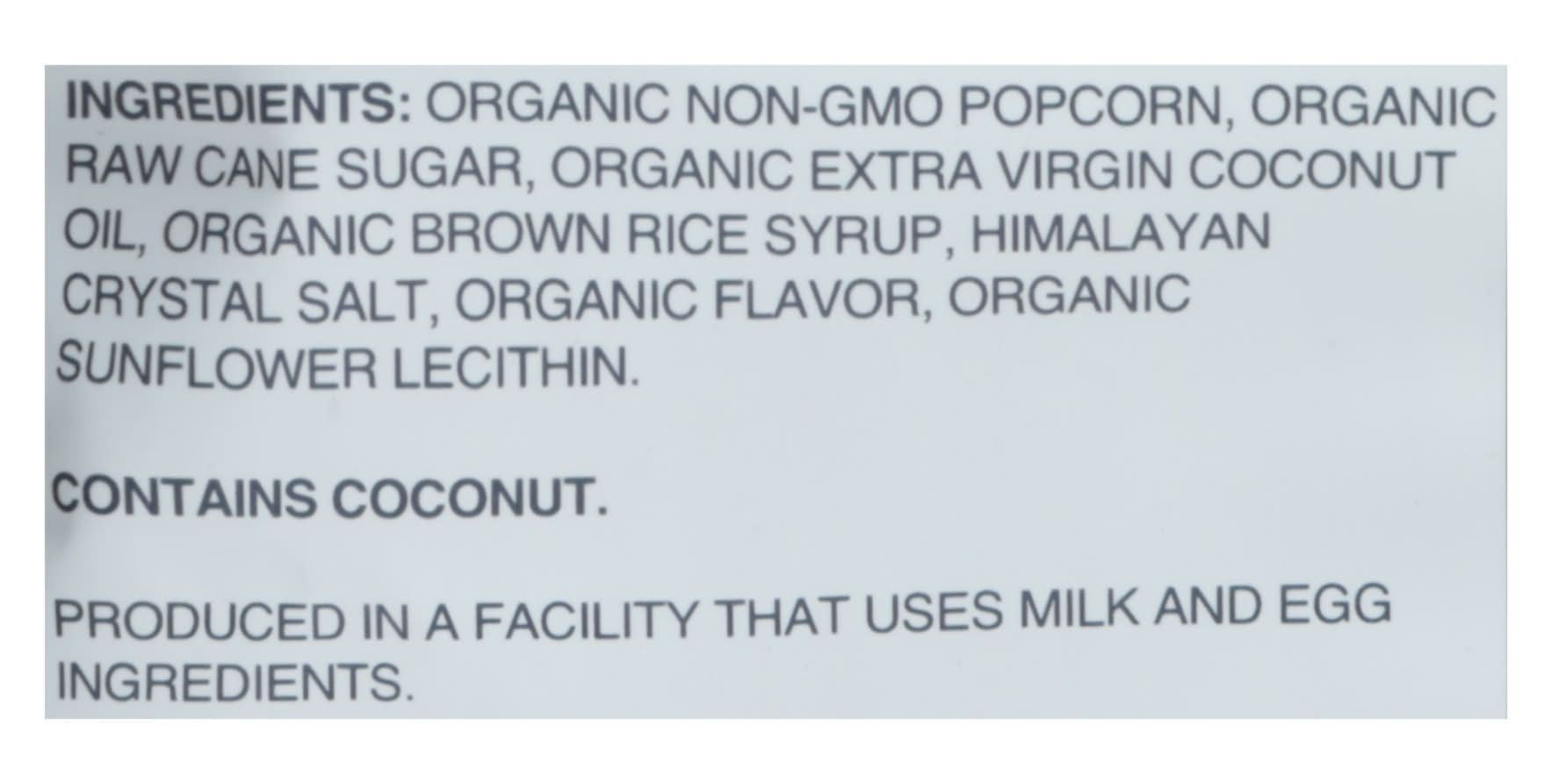 Ingredients: Organic Non-GMO Popcorn, Organic Raw Cane Sugar, Organic Extra Virgin Coconut Oil, Organic Brown Rice Syrup, Himalayan Crystal Salt, Organic Flavor, Organic Sunflower Lecithin Contains: Corn, Tree Nuts, Coconuts, Eggs, Milk