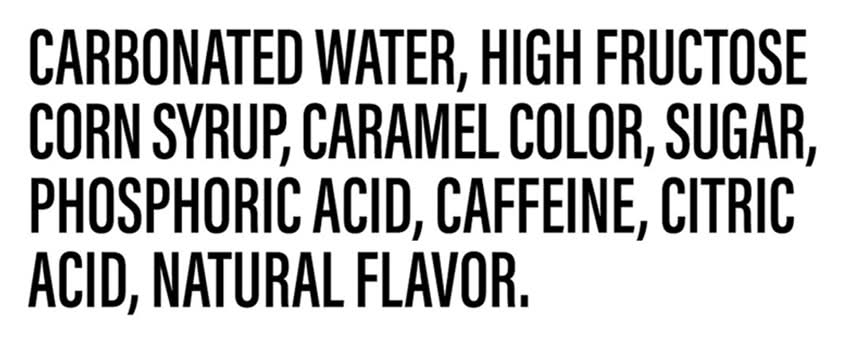 Ingredients: Carbonated Water, High Fructose Corn Syrup, Caramel Color, Sugar, Phosphoric Acid, Caffeine, Citric Acid, Natural Flavor Contains: Corn