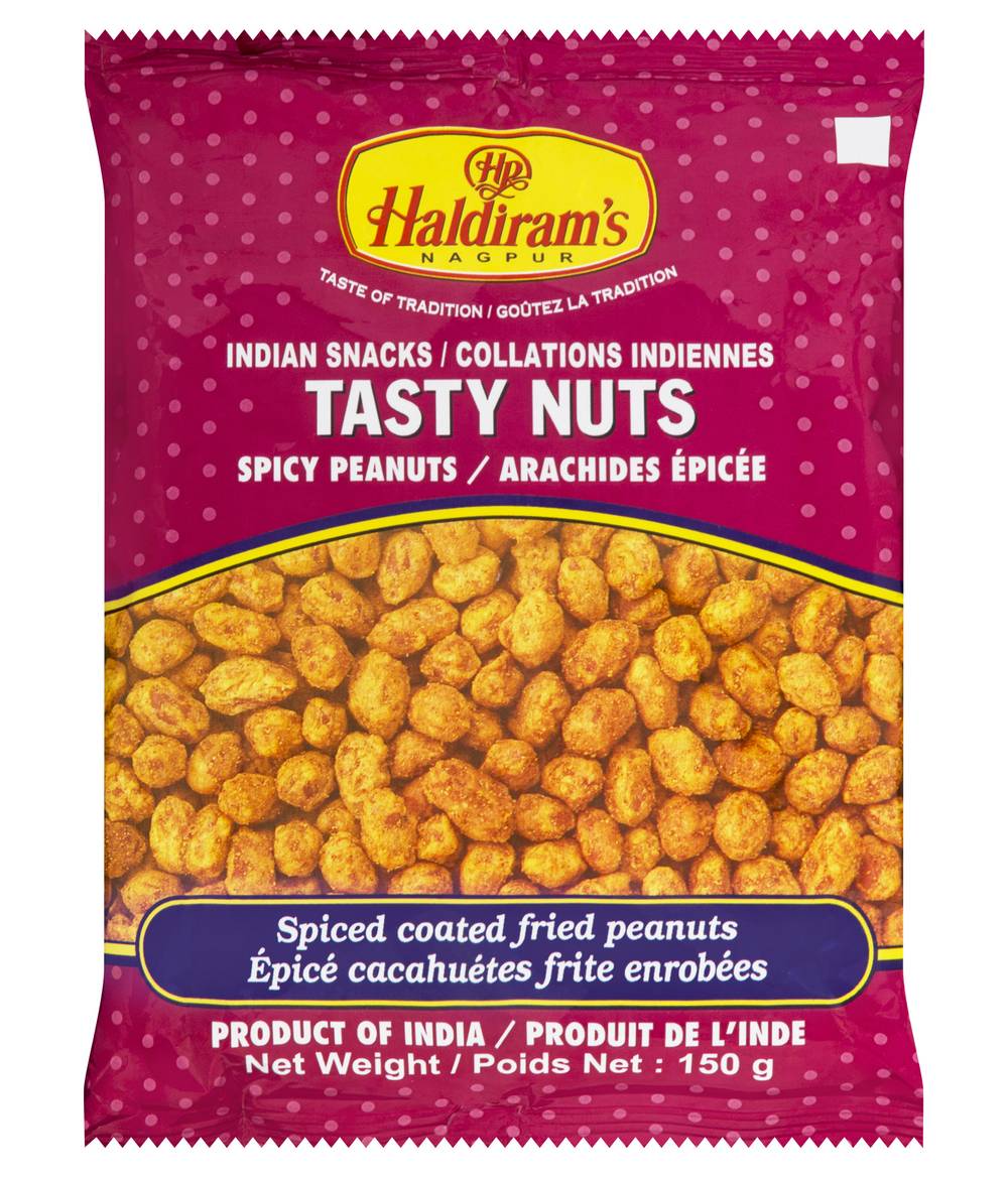 Haldiram Tasty Nuts are spice-coated fried peanuts, offering a savory snack option.