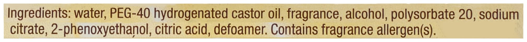 Ingredients: Water, PEG-40 Hydrogenated Castor Oil, Fragrance, Alcohol, Polysorbate 20, Sodium Citrate, 2-Phenoxyethanol, Citric Acid, Defoamer