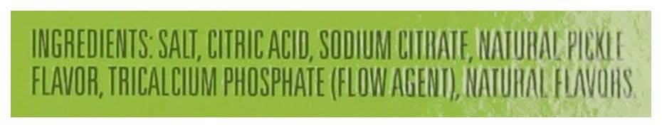 Ingredients: Salt, Citric Acid, Sodium Citrate, Natural Pickle Flavor, Tricalcium Phosphate (Flow Agent), Natural Flavors