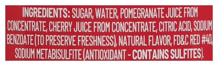 Ingredients: Sugar, Water, Pomegranate Juice from Concentrate, Cherry Juice from Concentrate, Citric Acid, Sodium Benzoate (to Preserve Freshness), Natural Flavor, FD&C Red No.40, Sodium Metabisulfite (Antioxidant - Contains Sulfites) Contains: Sulfites