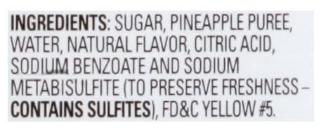 Ingredients: Sugar, Pineapple Puree, Water, Natural Flavor, Citric Acid, Sodium Benzoate and Sodium Metabisulfite (to Preserve Freshness - Contains Sulfites), FD&C Yellow 5