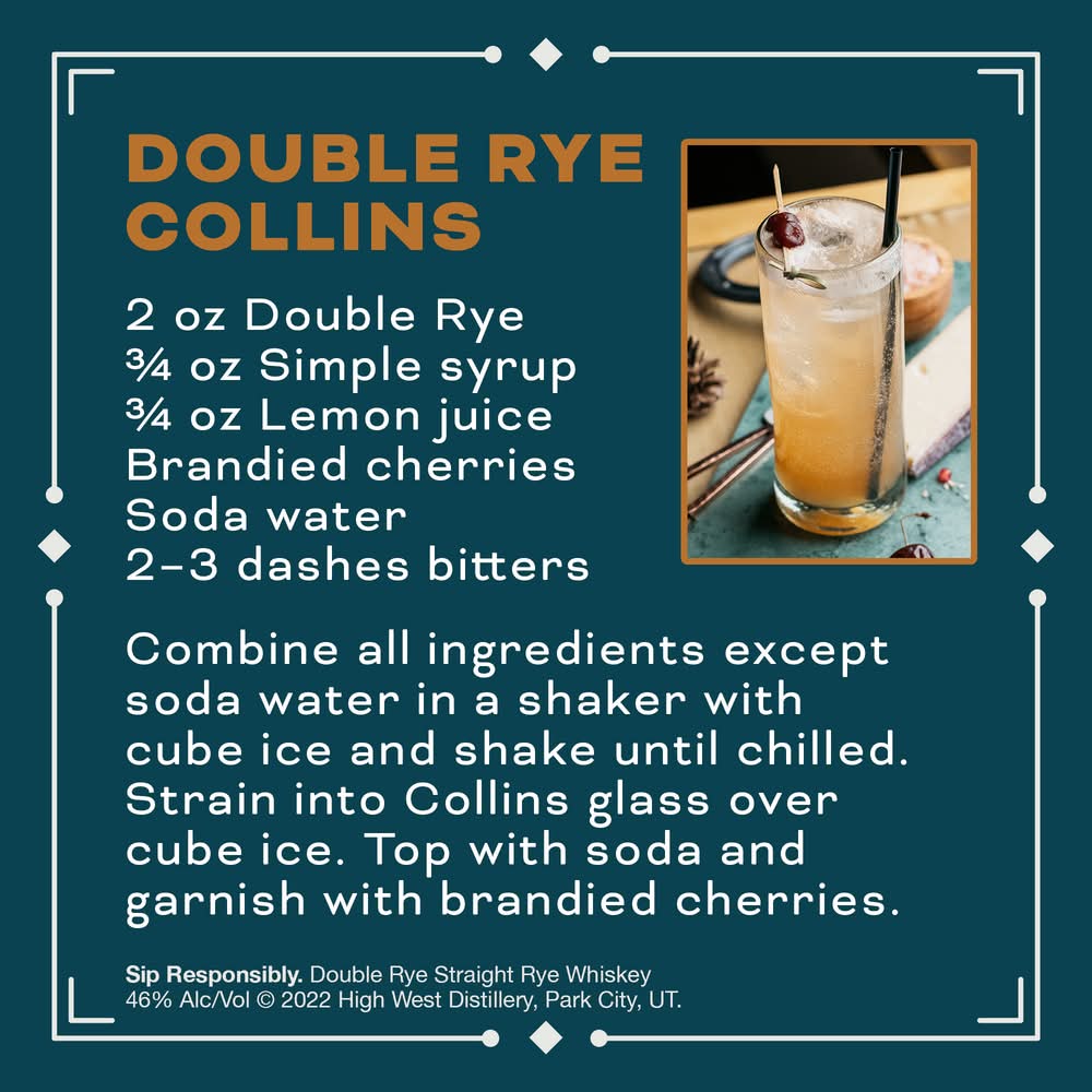 A blend of straight rye whiskeys. No coloring or flavoring added. We get asked all the time why double and why double, because this whiskey is created from two rye whiskeys (both a minimum of two years old; see highwest.com for technical details and sourcing). The exclamation point is to signify our aim with this whiskey: showcase the beauty that is rye and create the spiciest rye whiskey in the world. We think we did that. The younger rye - (sourced by High West) is produced on a column still and tastes of cinnamon, clove, anise, eucalyptus buttons, and evergreen gin-like flavors. The older rye (distilled by High West) made using a pot still adds a richer, bolder character and just enough caramel sweetness and woody vanilla richness to calm the bite of the younger rye. The resulting combination is bold, balanced, complex and perfect for mixing. We recommend trying a Double Rye Manhattan or old fashioned - it's also absolutely superb for sipping alone or sharing with other cowboys and good-looking strangers. High West is Utah's first legal distillery since 1870 and the world's only ski-in gastro-distillery. If you find yourself in Old Town Park City, please stop (or ski) by to visit us. We'd love to share our passions with you: the American West, our contemporary western victuals, American roots music, and of course, pairing all the above with our greatest passion-superb whiskey. Better yet, you ought to come out to our distillery in the mountains of Wanship, Utah. It's a celebration of cowboys and the American West. Founder, David Perkins. Master Distiller, Brendan Coyle. Not chill filtered. Artwork: David Levinthal, 1989. High West's home in historic Old Town Park City and the world's only skin gastro-distillery. highwest.com. Alcohol by volume: 46%