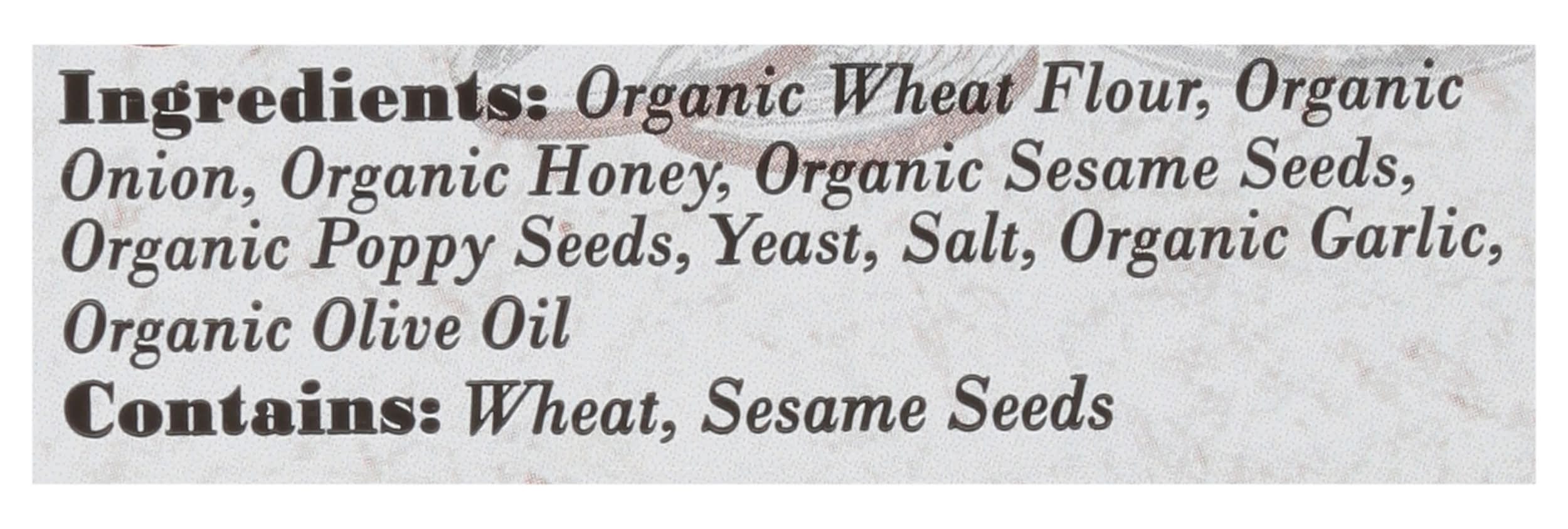 Ingredients: Organic Wheat Flour, Organic Onion, Organic Honey, Organic Sesame Seeds, Organic Poppy Seeds, Yeast, Salt, Organic Garlic, Organic Olive Oil Contains: Wheat, Sesame