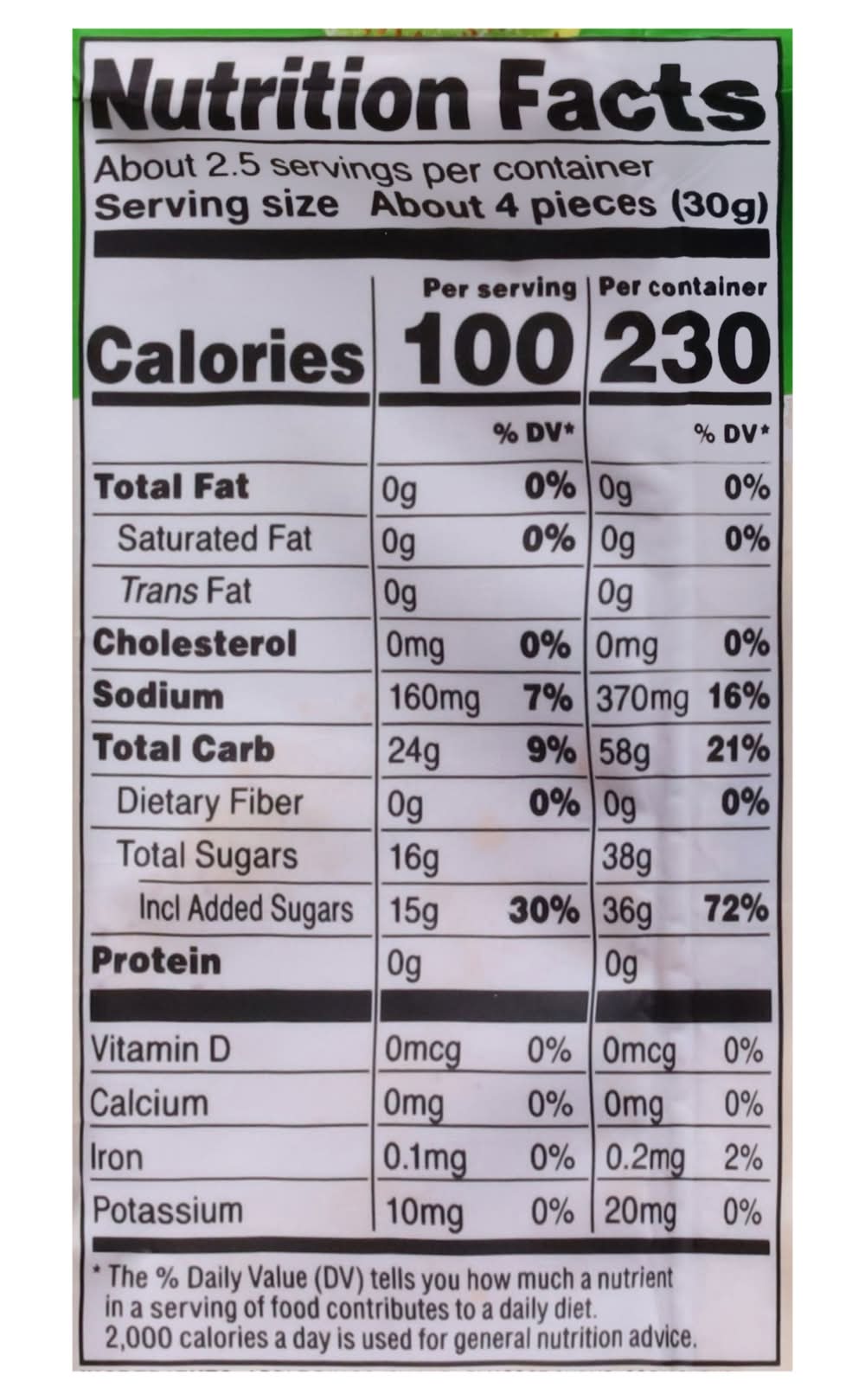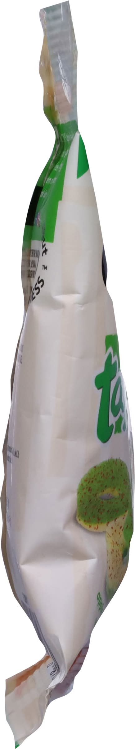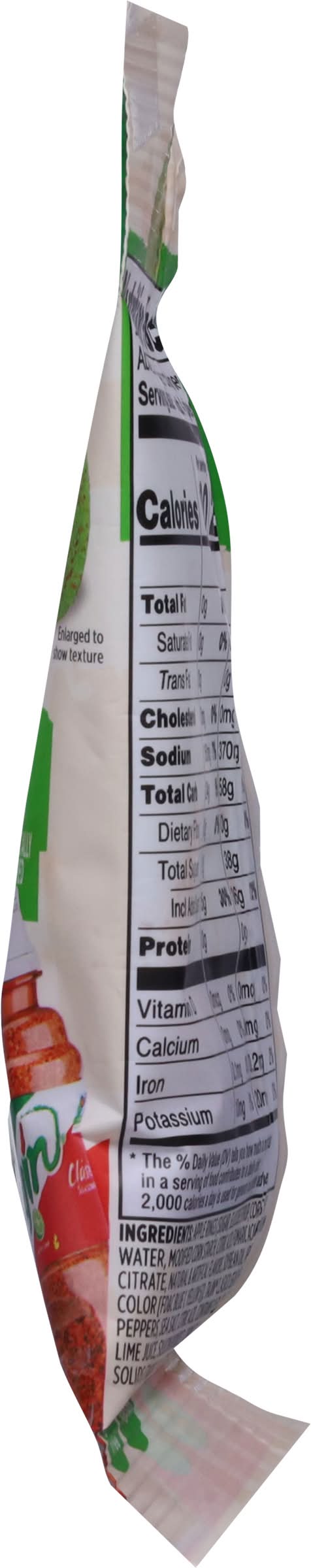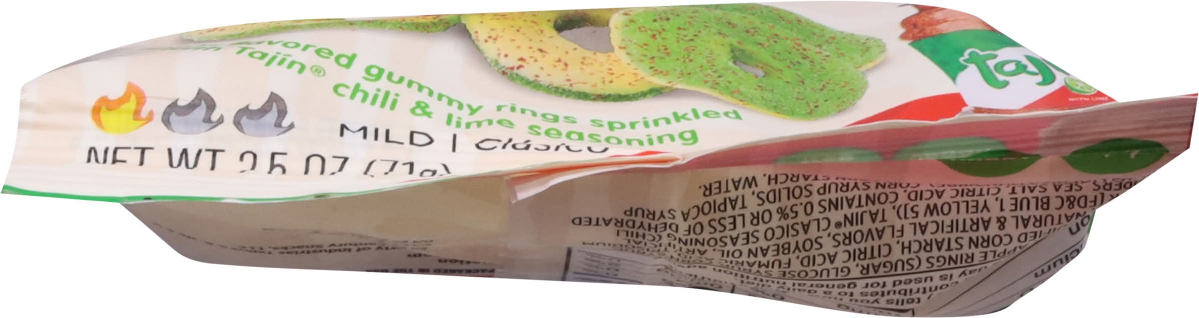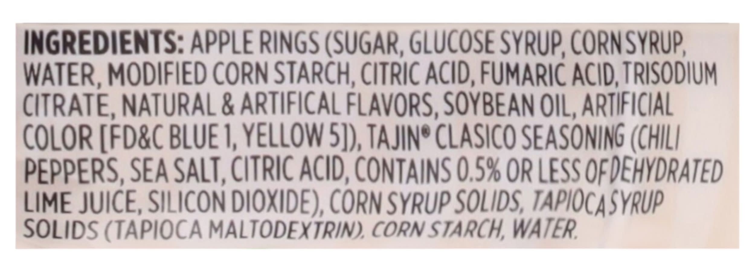 Ingredients: Apple Rings (Sugar, Glucose Syrup, Corn Syrup, Water, Modified Corn Starch, Citric Acid, Fumaric Acid, Trisodium Citrate, Natural & Artifical Flavors, Soybean Oil, Artificial Color [FD&C Blue 1, Yellow 5]), Tajin Clasico Seasoning (Chili Peppers, Sea Salt, Citric Acid, Contains 0.5% or Less of Dehydrated Lime Juice, Silicon Dioxide), Corn Syrup Solids, Tapioca Syrup Solids (Tapioca Maltodextrin) Corn Starch, Water Contains: Soybeans, Peanuts, Tree Nuts, Wheat, Soybeans, Milk, Sesame