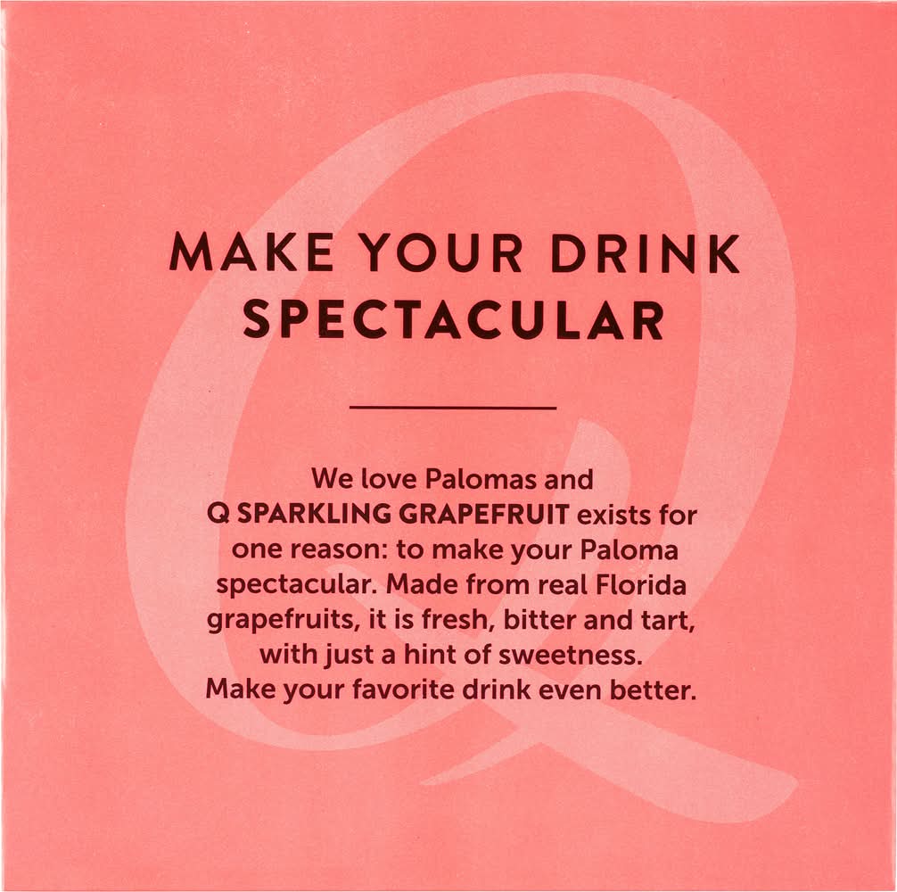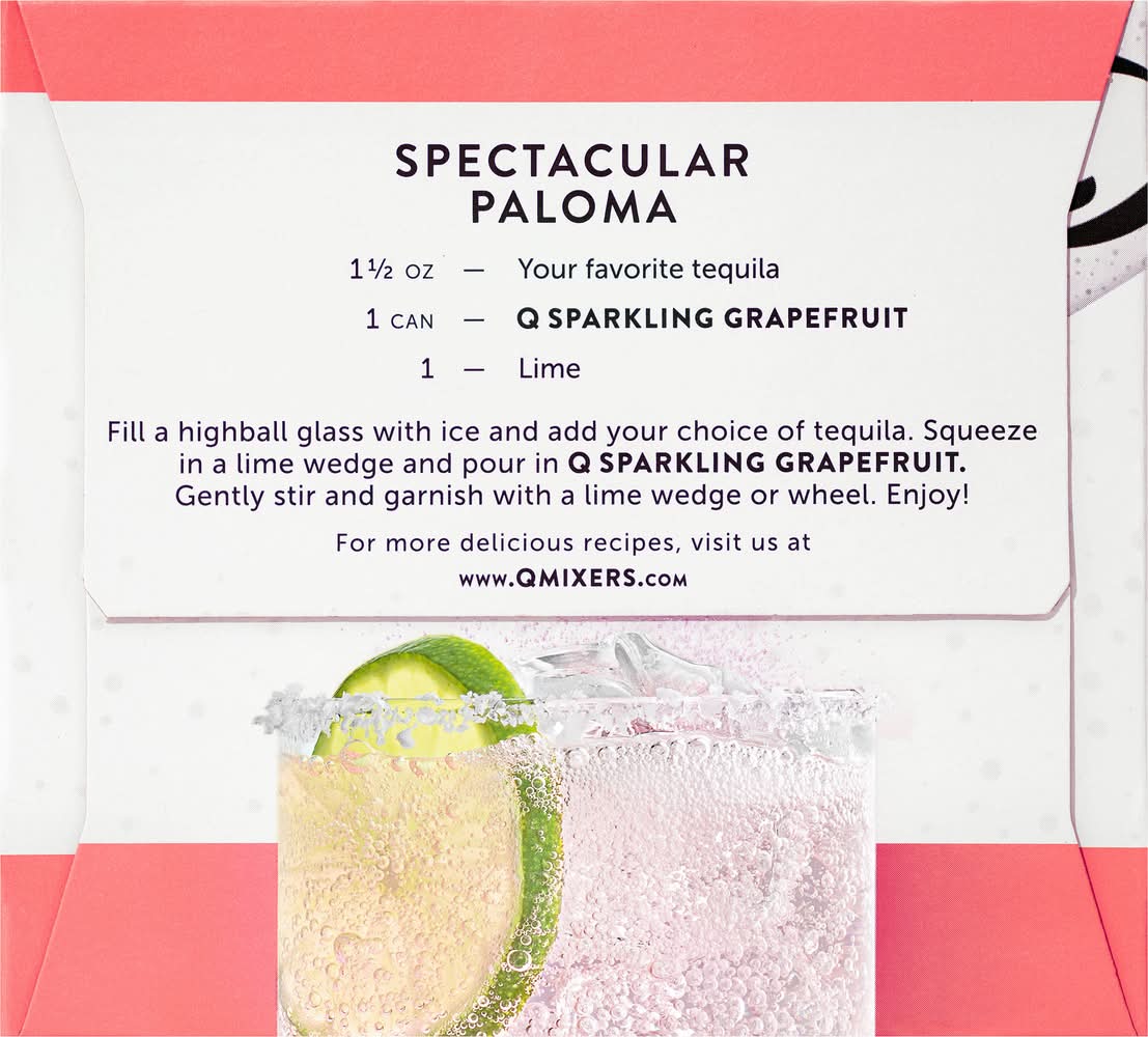 Directions: spectacular paloma: 1-1/2 oz your favorite tequila; 1 can - q sparkling grapefruit; 1 - lime. fill a highball glass with ice and add your choice of tequila. squeeze in a lime wedge and pour in q sparkling grapefruit. gently stir and garnish with a lime wedge or wheel. enjoy!