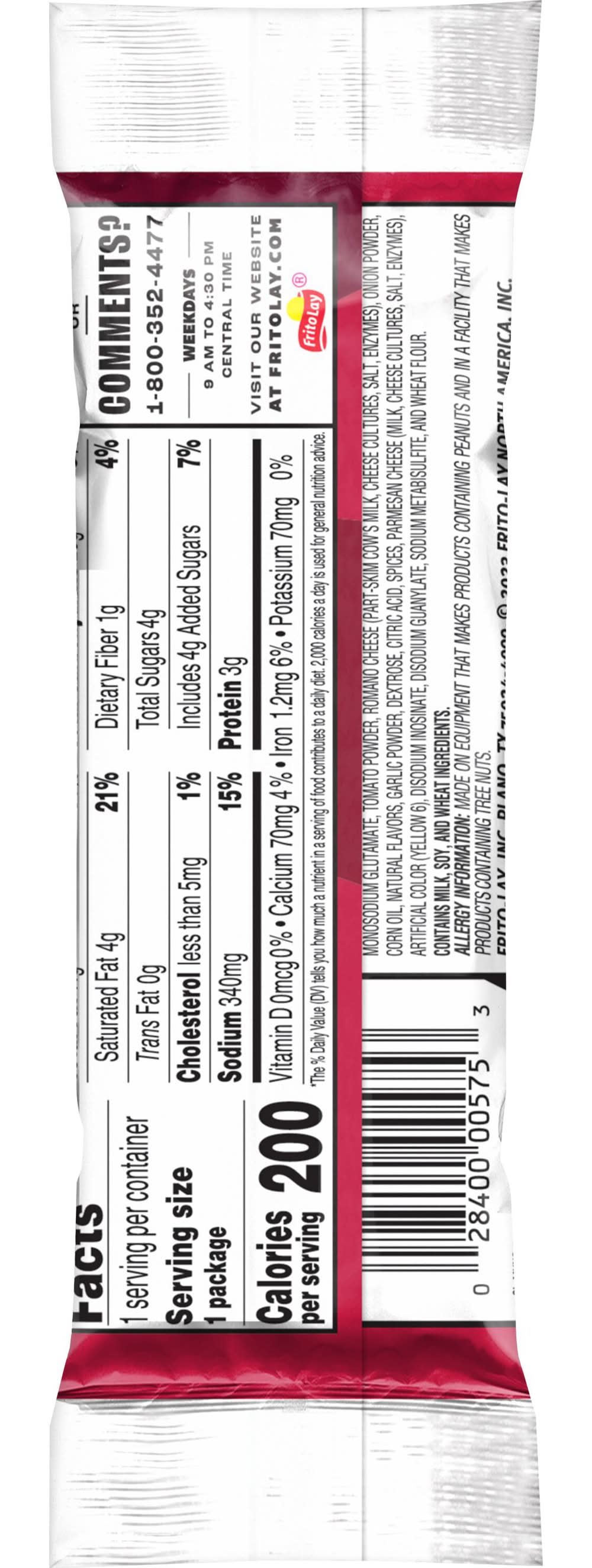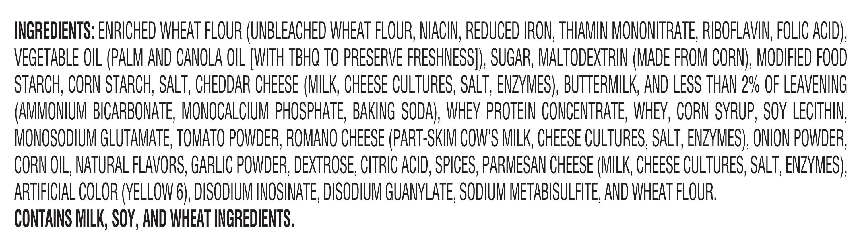 Ingredients: Enriched WHEAT Flour (Unbleached WHEAT Flour, Niacin, Reduced Iron, Thiamin Mononitrate, Riboflavin, Folic Acid), Vegetable Oil (Palm And Canola Oil [With TBHQ To Preserve Freshness]), Sugar, Maltodextrin (Made From Corn), Modified Food Starch, Corn Starch, Salt, Cheddar Cheese (Milk, Cheese Cultures, Salt, Enzymes), Buttermilk, And Less Than 2% Of Leavening (Ammonium Bicarbonate, Monocalcium Phosphate, Baking Soda), Whey Protein Concentrate, Whey, Corn Syrup, SOY Lecithin, Monosodium Glutamate, Tomato Powder, Romano Cheese (Part-Skim Cow's Milk, Cheese Cultures, Salt, Enzymes), Onion Powder, Corn Oil, Natural Flavors, Garlic Powder, Dextrose, Citric Acid, Spices, Parmesan Cheese (Milk, Cheese Cultures, Salt, Enzymes), Artificial Color (Yellow 6), Disodium Inosinate, Disodium Guanylate, Sodium Metabisulfite, And WHEAT Flour. CONTAINS MILK, SOY, AND WHEAT INGREDIENTS. ALLERGY INFORMATION: MADE ON EQUIPMENT THAT MAKES PRODUCTS CONTAINING PEANUTS AND IN A FACILITY THAT MAKES PRODUCTS CONTAINING TREE NUTS. Contains: CONTAINS MILK, SOY, AND WHEAT INGREDIENTS. \nALLERGY INFORMATION: MADE ON EQUIPMENT THAT MAKES PRODUCTS CONTAINING PEANUTS AND IN A FACILITY THAT MAKES PRODUCTS CONTAINING TREE NUTS.