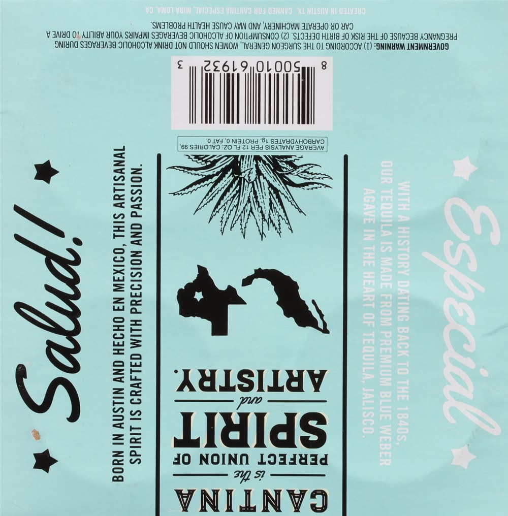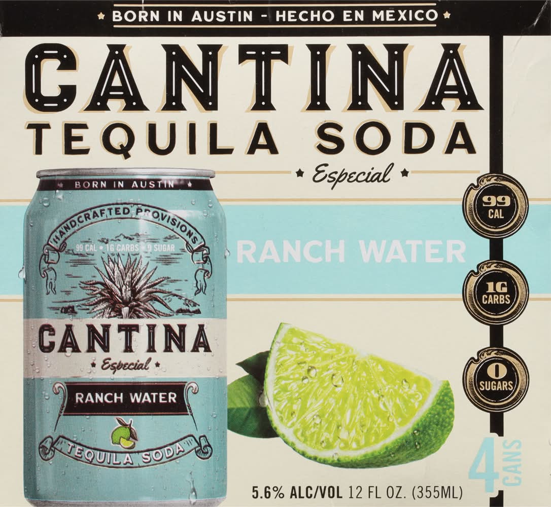 99 cal. 1 g carbs. 0 sugars. Cantina is the perfect union of spirit and artistry. Especial. Handcrafted provisions. With a history dating back to the 1840s, our tequila is made from premium blue weber agave in the heart of tequila, Jalisco. 5.6% alc/vol. 11.2 Born in Austin. Born in Austin and Hecho en Mexico, this artisanal spirit is crafted with precision and passion. • Flavor: Ranch water • Pack size: 4 • Alcohol by volume: 5.6%