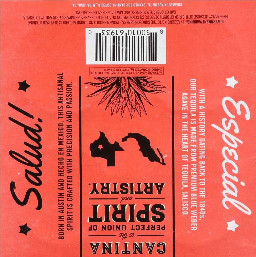 99 cal; 1 g carbs; 0 sugars. Cantina is the perfect union of spirit and artistry. With a history dating back to the 1840s, our tequila is made from premium blue weber agave in the heart of tequila, Jalisco. 11.2 Born in Austin - Hecho en Mexico. Born in Austin and Hecho en Mexico, this artisanal spirit is crafted with precision and passion. Crafteed in Austin TX, Canned for Cartina Especial, Mira Loma, CA. • Pack size: 4 • Alcohol by volume: 5.6% • Packaging: Reusable