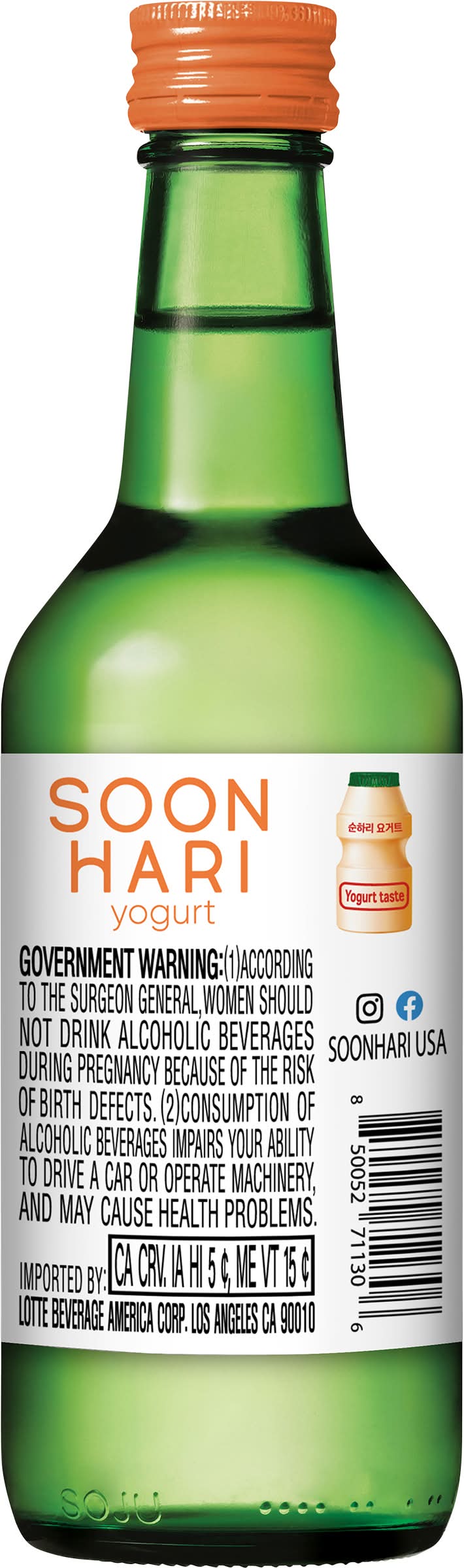 Discover a World of Flavors. Soonhari is the original flavored Soju, a Korean spirit made from Rice, Tapioca, Barley and Wheat with a neutral taste. This crisp and aromatic soju has notes of lemon, melon, and peach. It is refreshing with a subtle tang and approachable creamy flavor. Pair this yogurt soju with Korean fried chicken, fresh fruit, and desserts. Soonhari comes in a variety of delicious flavors: Peach, Strawberry, Apple Mango, Yogurt, Apple, Grape, & Citron. Flavor: Yogurt