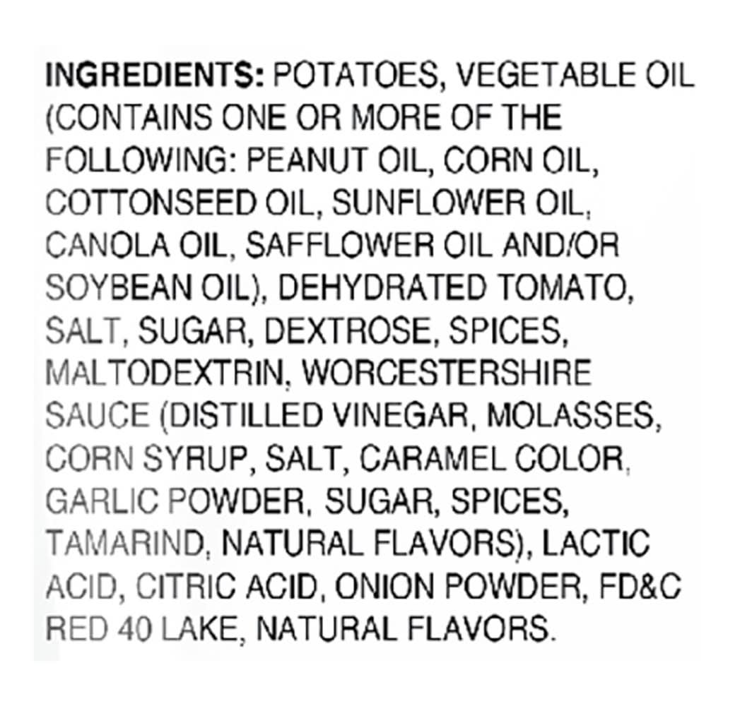 Ingredients: Potatoes, Vegetable Oil (Contains One or More of the Following: Peanut Oil, Corn Oil, Cottonseed Oil, Sunflower Oil, Canola Oil, Safflower Oil and/or Soybean Oil), Dehydrated Tomato, Salt, Sugar, Dextrose, Spices, Maltodextrin, Worcestershire Sauce (Distilled Vinegar, Molasses, Corn Syrup, Salt, Caramel Color, Garlic Powder, Sugar, Spices, Tamarind, Natural Flavors), Lactic Acid, Citric Acid, Onion Powder, FD&C Red 40 Lake, Natural Flavors Contains: Corn, Peanuts, Soybeans