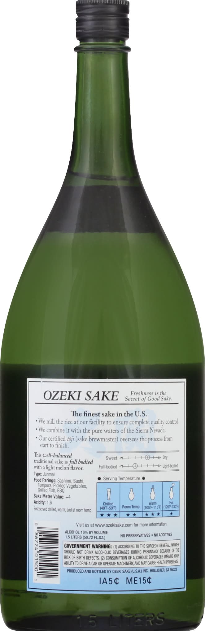 Since 1711. Freshness is the Secret of Good Sake. The Finest Sake in the US: We mill the rice at our facility to ensure complete quality control; we combine it with the pure waters of the Sierra Nevada; Our certified oversees the process from start to finish. This well-balanced traditional sake is full bodied with a light melon flavor. Alcohol by volume: 16%