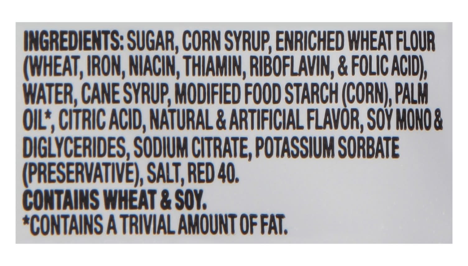 Ingredients: Sugar, Corn Syrup, Enriched Wheat Flour (Wheat, Iron, Niacin, Thiamin, Riboflavin, & Folic Acid), Water, Cane Syrup, Modified Food Starch (Corn), Palm Oil (Contains a Trivial Amount of Fat), Citric Acid, Natural & Artificial Flavor, Soy Mono & Diglycerides, Sodium Citrate, Potassium Sorbate (Preservative), Salt, Red 40 Contains: Wheat, Soybeans, Corn