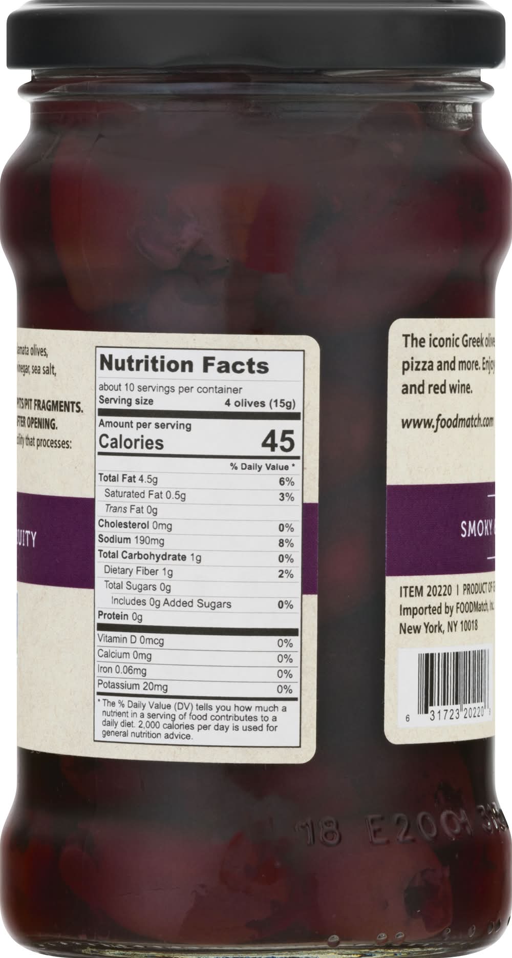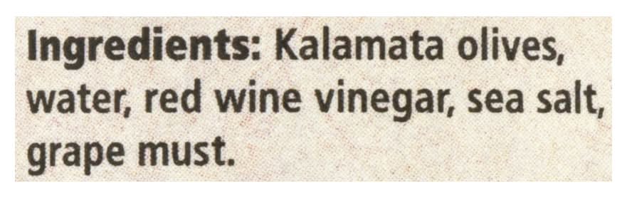 Ingredients: Kalamata Olives, Water, Red Wine Vinegar, Sea Salt, Grape Must Contains: Milk, Tree Nuts