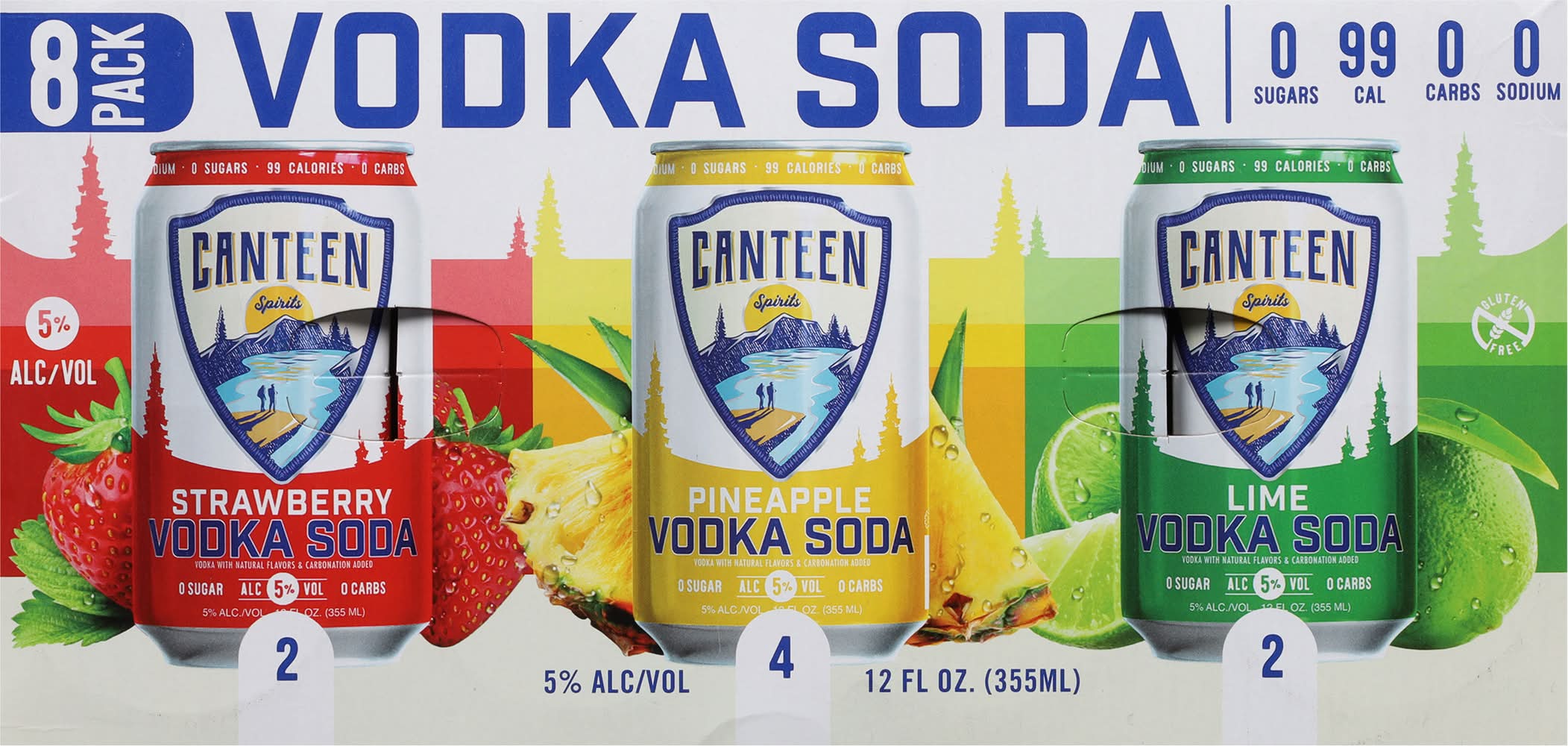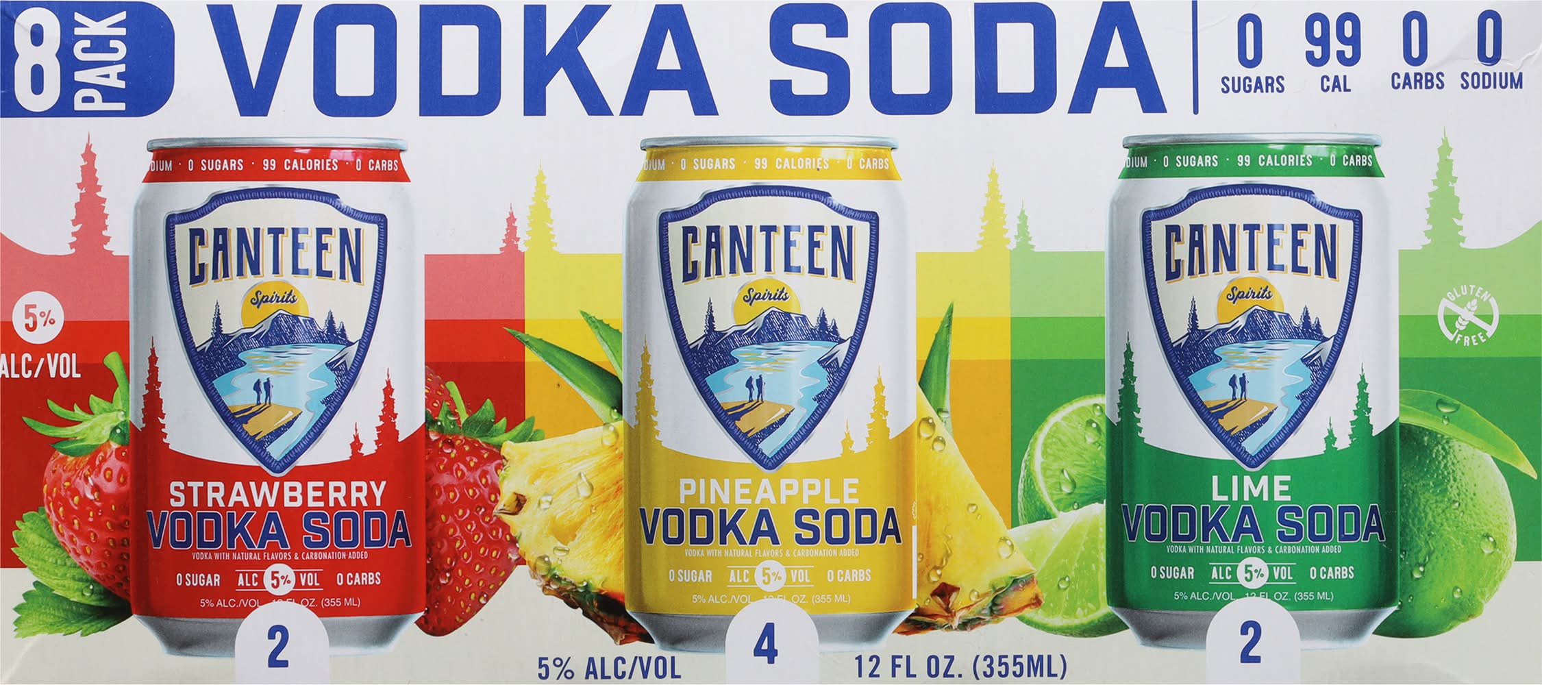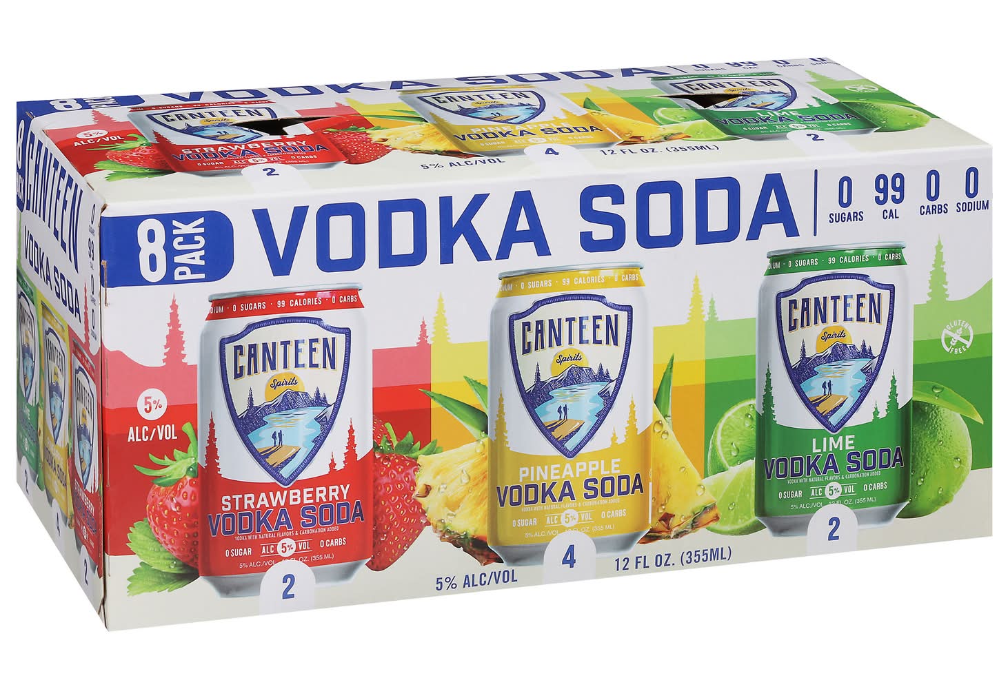 2 - Strawberry Vodka Soda. 4 - Pineapple Vodka Soda. 2 - Lime Vodka Soda. Strawberry: Vodka with natural flavors & carbonation added. Pineapple: Vodka with natural flavors & carbonation added. Lime: Vodka with natural flavors & carbonation added. 10 Product of USA. Canned for Canteen Spirits, Austin TX. • Flavor: Assorted • Pack size: 8 • Alcohol by volume: 5%
