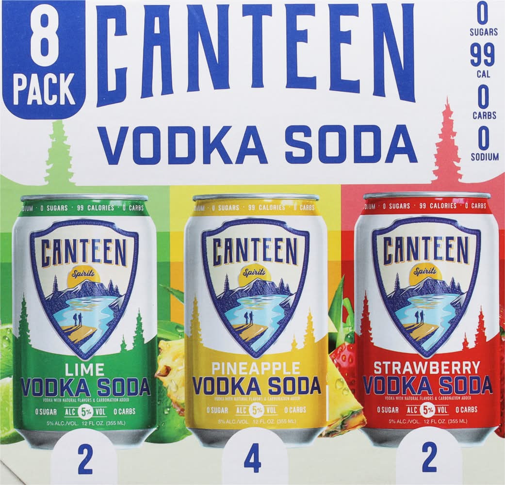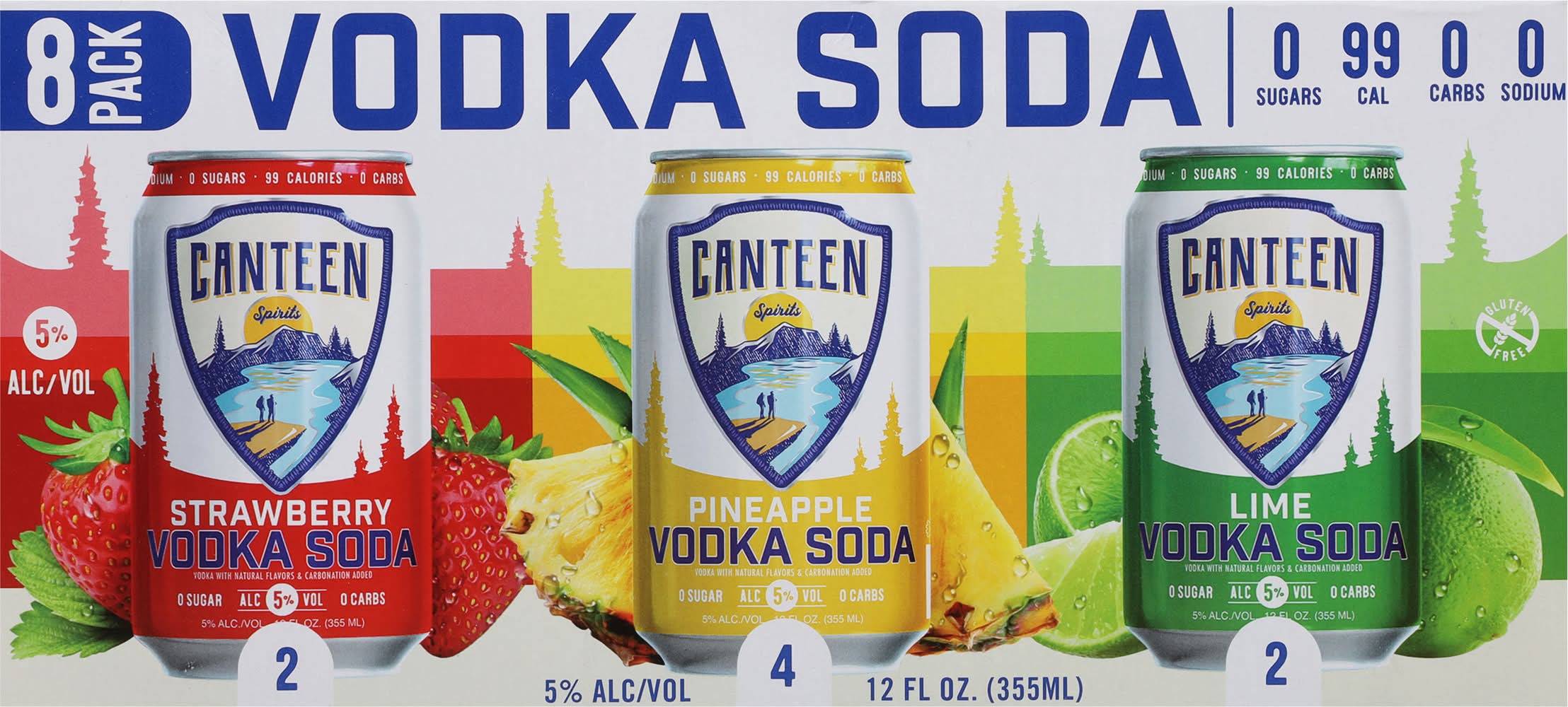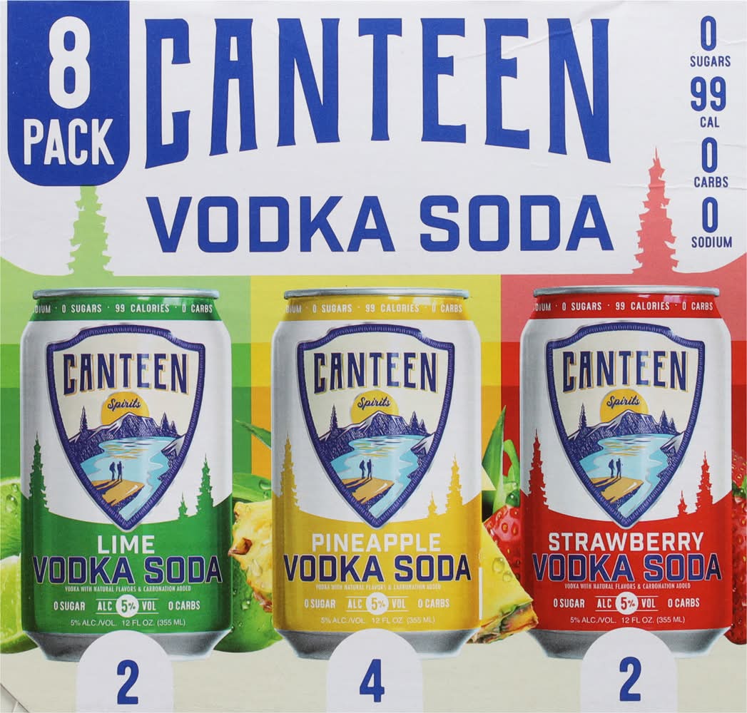 2 - Strawberry Vodka Soda. 4 - Pineapple Vodka Soda. 2 - Lime Vodka Soda. Strawberry: Vodka with natural flavors & carbonation added. Pineapple: Vodka with natural flavors & carbonation added. Lime: Vodka with natural flavors & carbonation added. 10 Product of USA. Canned for Canteen Spirits, Austin TX. • Flavor: Assorted • Pack size: 8 • Alcohol by volume: 5%