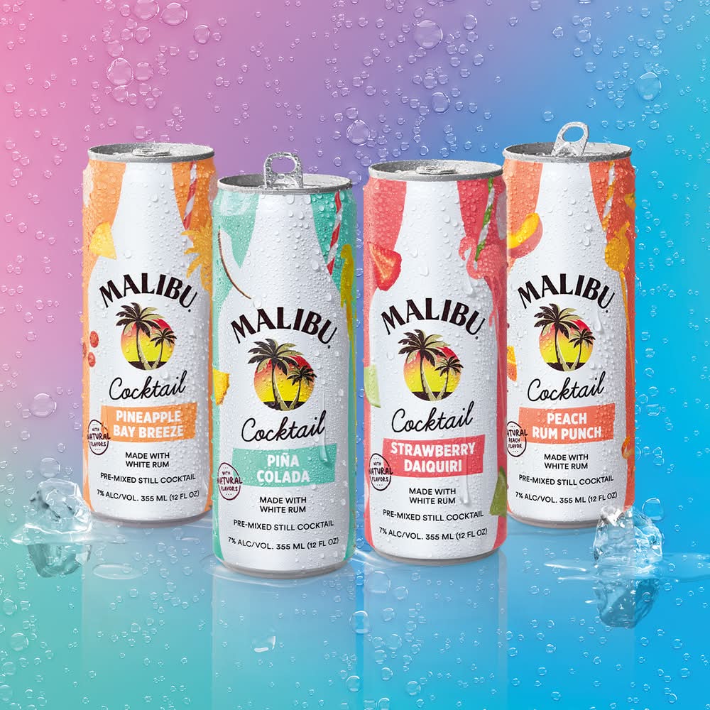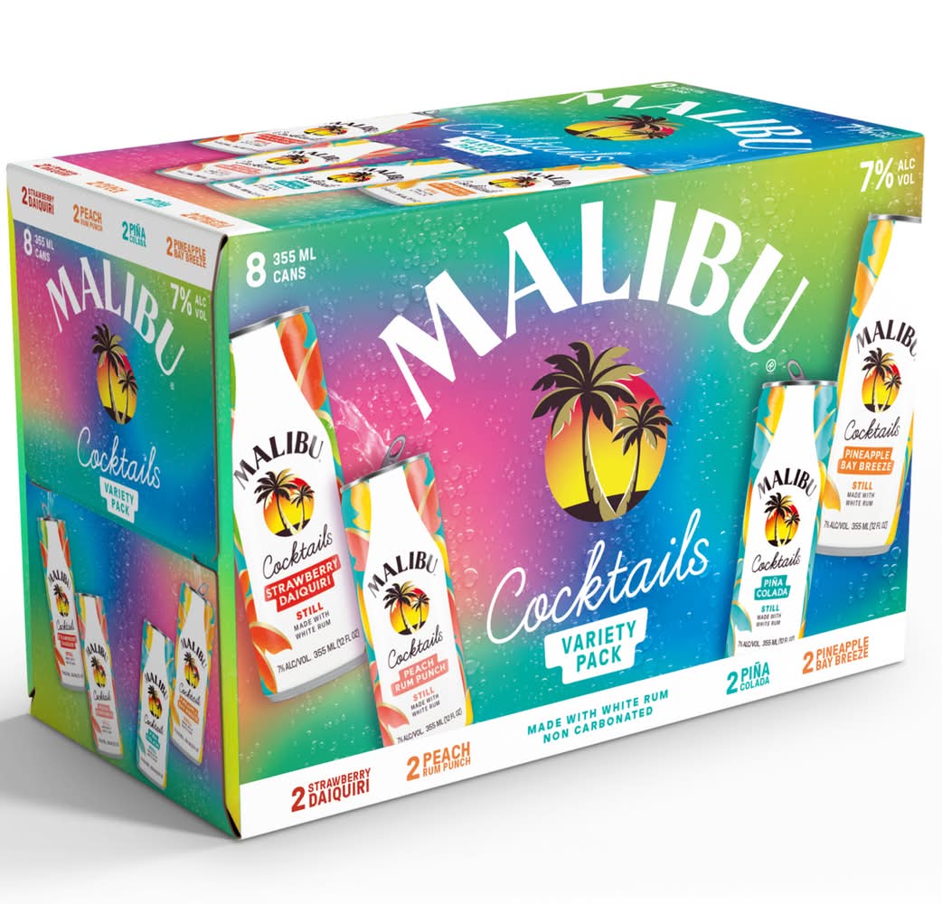 Enjoy the delicious and refreshing taste of the ready-to-sip Malibu Variety Pack, including flavors like Pineapple Bay Breeze, Pina Colada, Strawberry Daquiri and Peach Rum Punch, all in convenient and sleek 12 fl oz cans that are perfect for your next hangout. • Flavor: Assorted • Pack size: 8 • Alcohol by volume: 7%